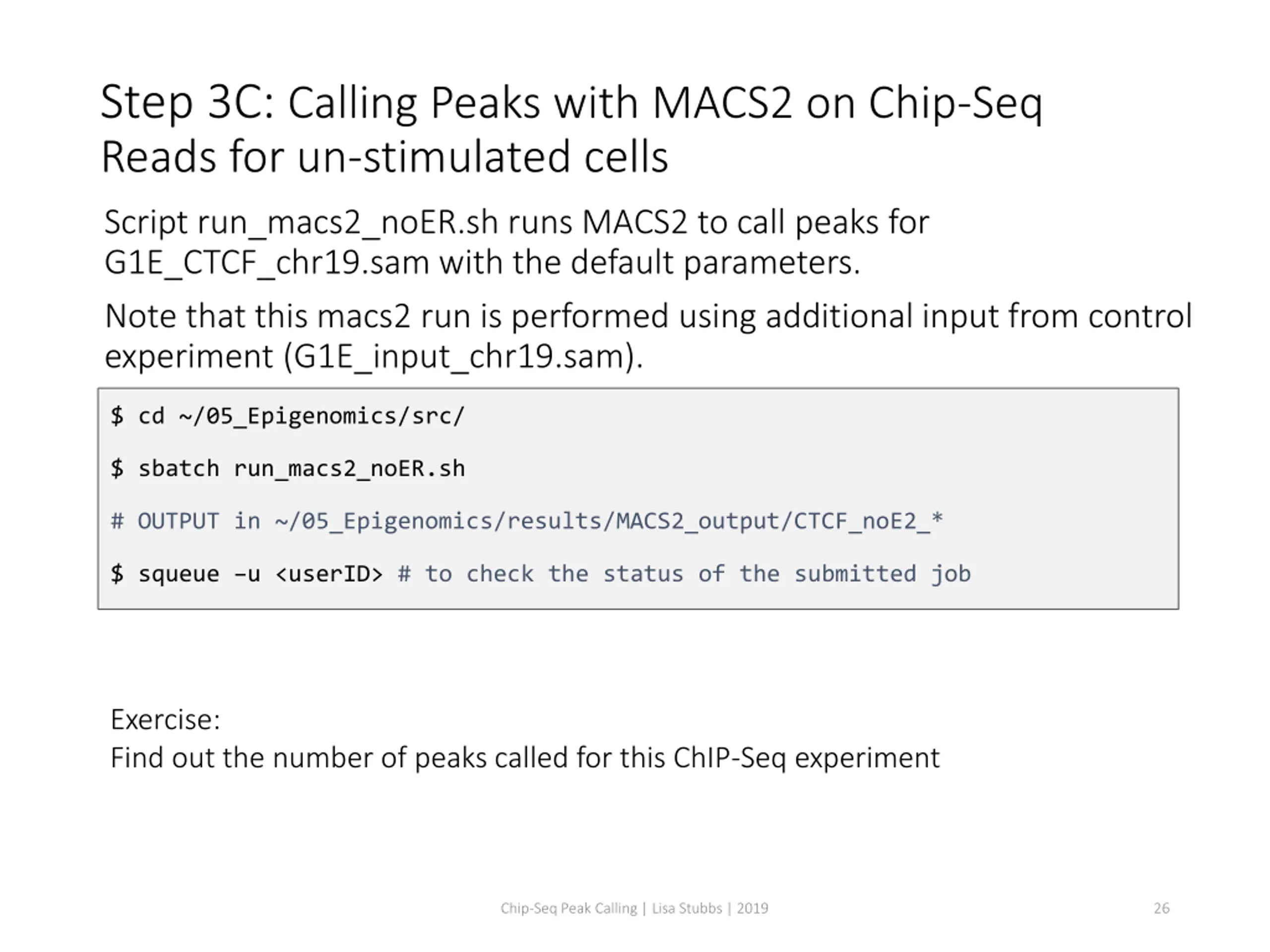 Step 3B: Calling Peaks with MACS2 using Control Chip-Seq Reads Script run_macs2_noControl.sh runs MACS2 to call peaks for G1E_ER4_CTCF_chr19.sam with the default parameters. Note that this macs2 run is performed using additional input from control experiment (G1E_ER4_input_chr19.sam ). $ cd ~/05_Epigenomics/src/ $ sbatch run_macs2_withControl.sh # OUTPUT in ~/05_Epigenomics/results/MACS2_output/CTCF_ER4_withControl* $ squeue u <userID> # to check the status of the submitted job Number of peaks called using the additional control experiment input can be obtained using: $ cat ../results/MACS2_output/CTCF_ER4_withControl_peaks.narrowPeak | wc -l # You should get 528 Chip-Seq Peak Calling | Lisa Stubbs | 2019 24