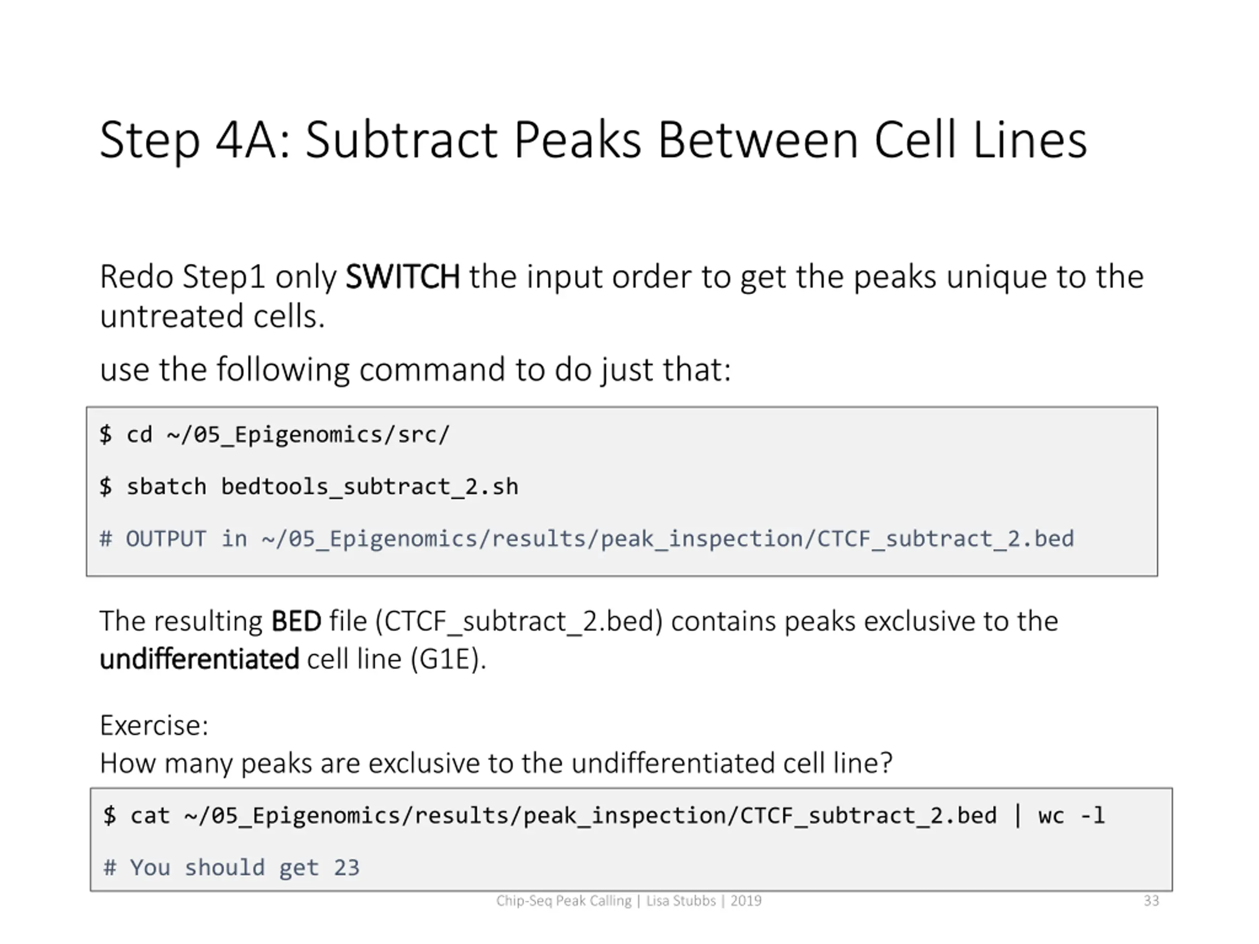 Step 4A: Subtract Peaks Between Cell Lines. Use the following command to find peaks in E2 treated cells that are absent in untreated cells: $ cd ~/05_Epigenomics/src/ $ sbatch bedtools_subtract_1.sh # OUTPUT in ~/05_Epigenomics/results/peak_inspection/CTCF_subtract_1.bed $ squeue u <userID> # to check the status of the submitted job The resulting BED differentiated differentiated cell line (G1E-ER4). BED file (CTCF_subtract_1.bed) contains peaks exclusive to the Discussion Discussion 1. How many peaks are exclusive to G1E-ER4? $ cat ~/05_Epigenomics/results/peak_inspection/CTCF_subtract_1.bed | wc -l # You should get 136 Chip-Seq Peak Calling | Lisa Stubbs | 2019 31