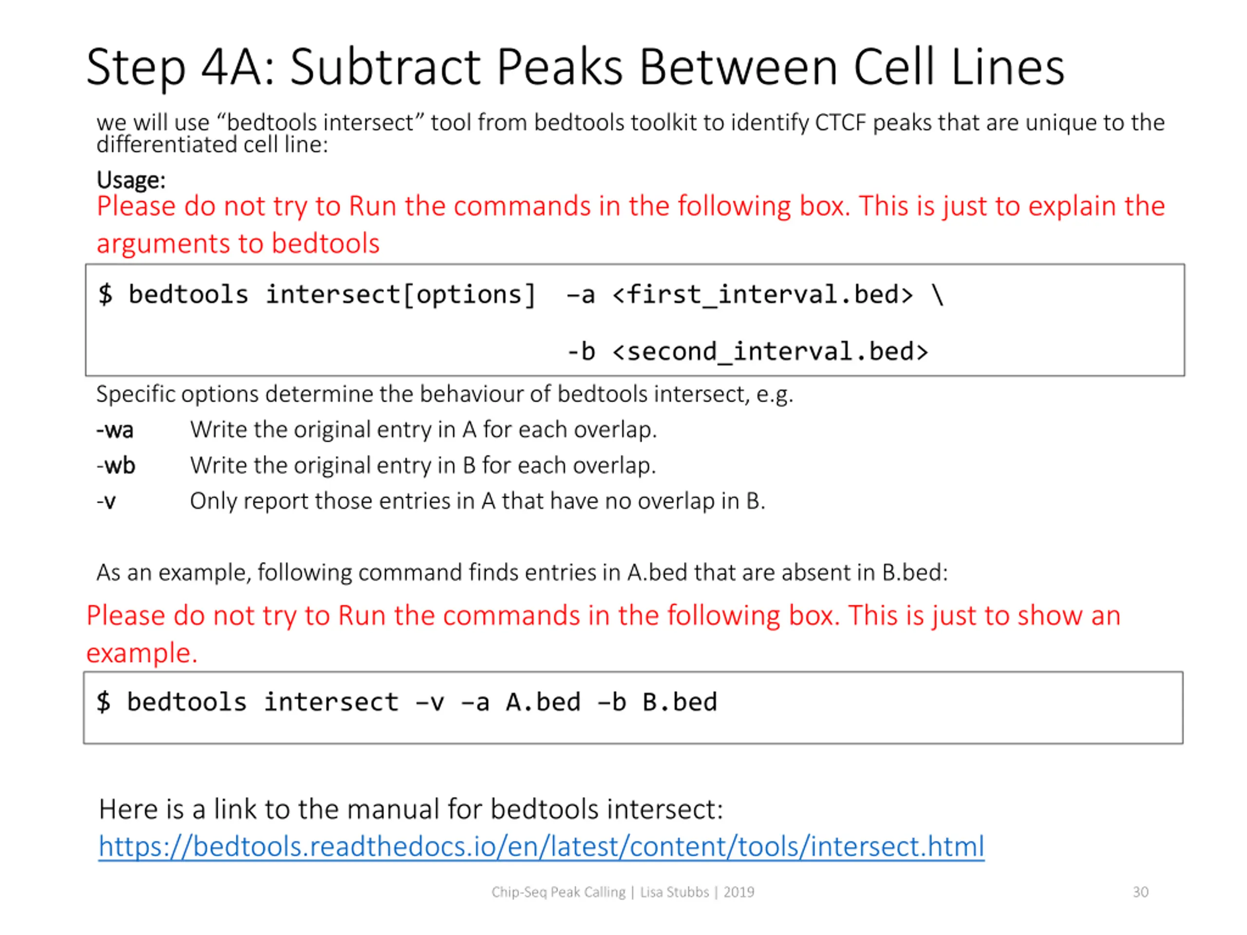 Step 4A: Subtract Peaks Between Cell Lines we will use bedtools intersect tool from bedtools toolkit to identify CTCF peaks that are unique to the differentiated cell line: Usage: Usage: Please do not try to Run the commands in the following box. This is just to explain the arguments to bedtools $ bedtools intersect[options] a <first_interval.bed> \ -b <second_interval.bed> Specific options determine the behaviour of bedtools intersect, e.g. - -wa wa Write the original entry in A for each overlap. -wb wb Write the original entry in B for each overlap. -v v Only report those entries in A that have no overlap in B. As an example, following command finds entries in A.bed that are absent in B.bed: Please do not try to Run the commands in the following box. This is just to show an example. $ bedtools intersect v a A.bed b B.bed Here is a link to the manual for bedtools intersect: https://bedtools.readthedocs.io/en/latest/content/tools/intersect.html Chip-Seq Peak Calling | Lisa Stubbs | 2019 30