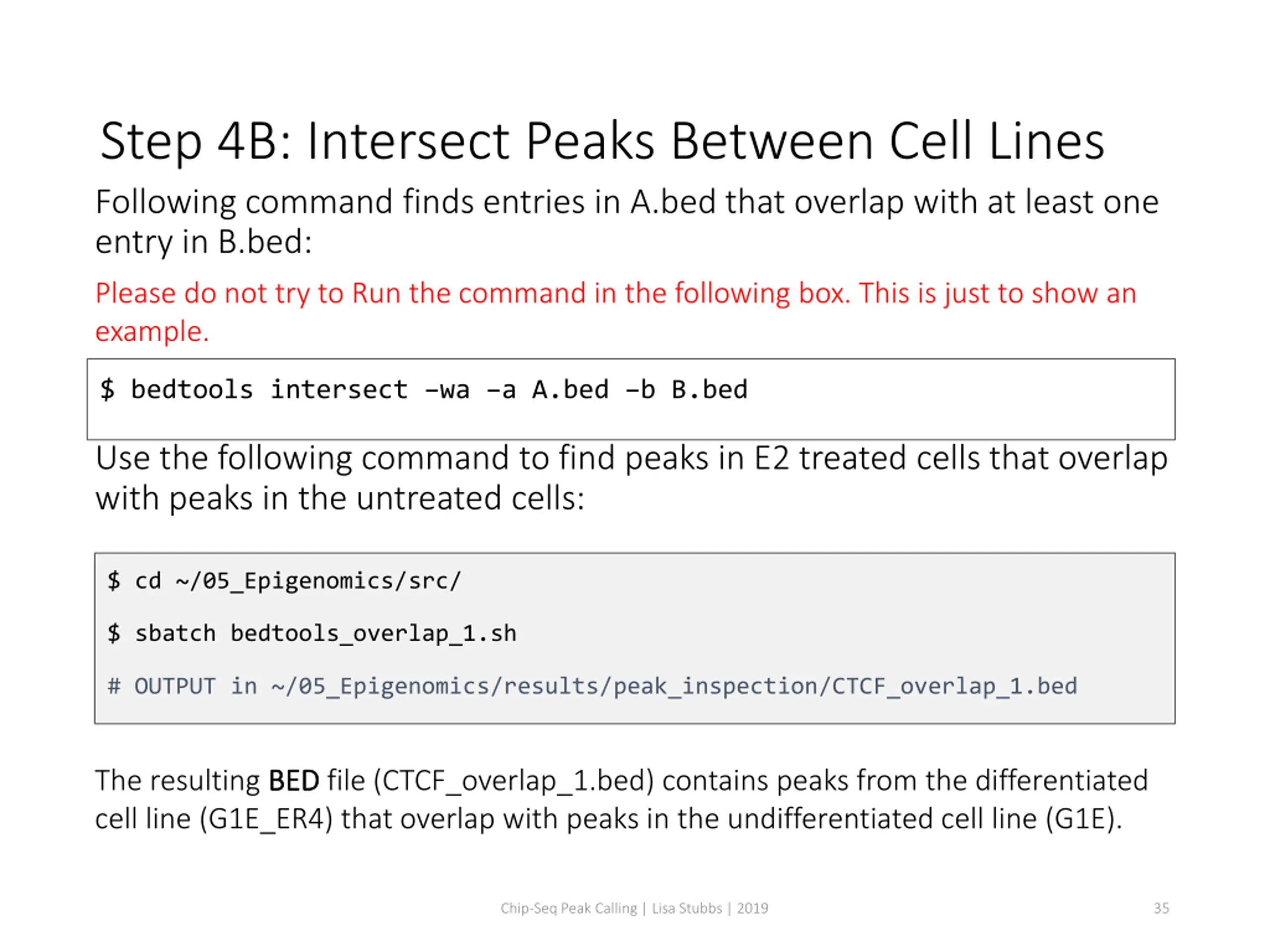 Please do not try to Run the commands in this slide. This is just to explain what the script that we just ran (bedtools_subtract_2.sh) is supposed to do in more detail. What s inside the bedtools_subtract_2.sh script? #!/bin/bash #SBATCH -c 1 #SBATCH --mem 8000 #SBATCH -A Mayo_Workshop #SBATCH -J bedtools_subt2 #SBATCH -o bedtools_subt2.%j.out #SBATCH -e bedtools_subt2.%j.err #SBATCH -p classroom Tells the cluster job manager what resources you want (1 CPU, 8GB memory, run on the classroom nodes, and name the job bedtools_subt2 Load the software. We use a tool called BEDTools to work with generated peak files. # load the tool environment module load BEDTools # this is our input (bed like) export PEAK_1=../results/MACS2_output/CTCF_ER4_withControl_peaks.narrowPeak export PEAK_2=../results/MACS2_output/CTCF_noE2_peaks.narrowPeak Create shortcut names for the two input bed files, and the output bed file. mkdir -p ../results/peak_inspection # this is our output (bed like) export OUT_1=../results/peak_inspection/CTCF_subtract_2.bed This command, not to be run by you directly, executes the bedtools intersect using the v flag to get the difference between the two bed files, and store the results in CTCF_subtract_2.bed bedtools intersect -v -a $PEAK_2 -b $PEAK_1 > $OUT_1 Chip-Seq Peak Calling | Lisa Stubbs | 2019 34