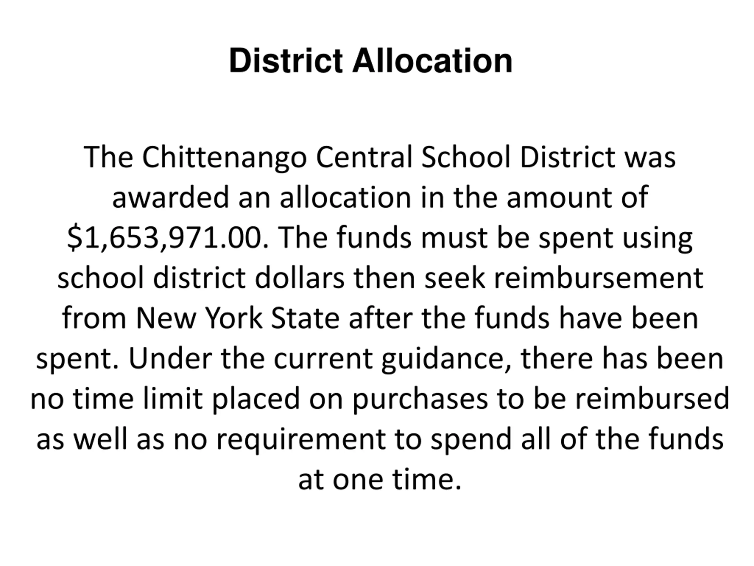 District Allocation The Chittenango Central School District was awarded an allocation in the amount of $1,653,971.00. The funds must be spent using school district dollars then seek reimbursement from New York State after the funds have been spent. Under the current guidance, there has been no time limit placed on purchases to be reimbursed as well as no requirement to spend all of the funds at one time.