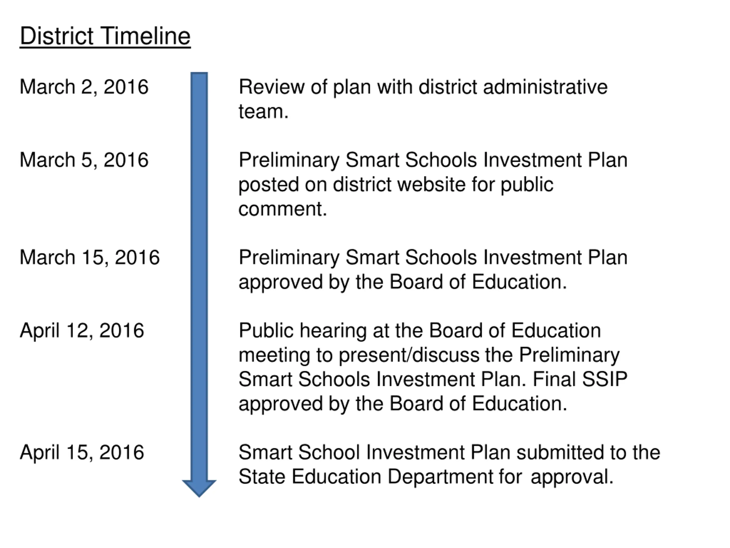 District Timeline March 2, 2016 Review of plan with district administrative team. March 5, 2016 Preliminary Smart Schools Investment Plan posted on district website for public comment. March 15, 2016 Preliminary Smart Schools Investment Plan approved by the Board of Education. April 12, 2016 April 15, 2016 Public hearing at the Board of Education meeting to present/discuss the Preliminary Smart Schools Investment Plan. Final SSIP approved by the Board of Education. Smart School Investment Plan submitted to the State Education Department for approval.
