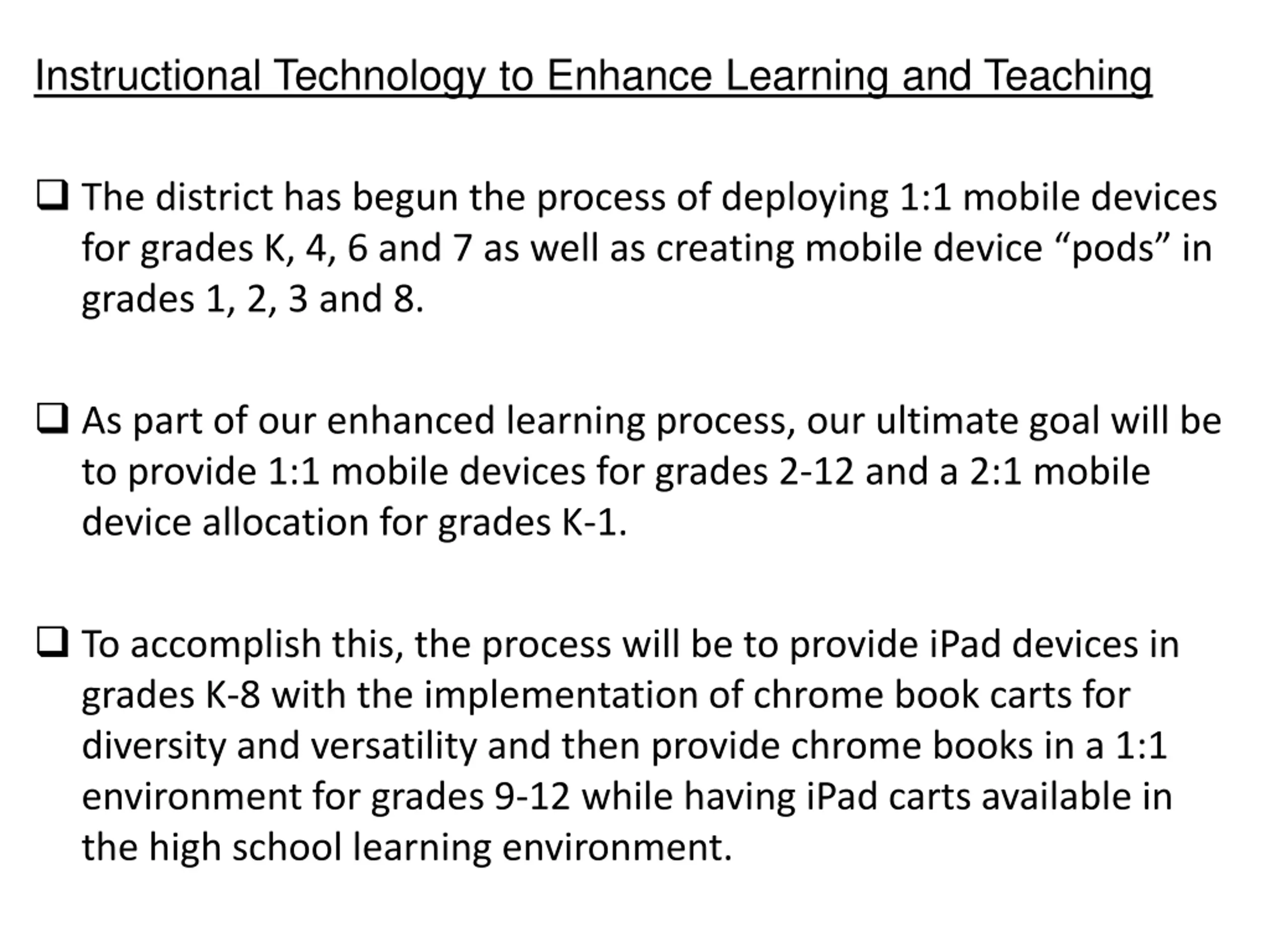 Instructional Technology to Enhance Learning and Teaching The district has begun the process of deploying 1:1 mobile devices for grades K, 4, 6 and 7 as well as creating mobile device pods in grades 1, 2, 3 and 8. As part of our enhanced learning process, our ultimate goal will be to provide 1:1 mobile devices for grades 2-12 and a 2:1 mobile device allocation for grades K-1. To accomplish this, the process will be to provide iPad devices in grades K-8 with the implementation of chrome book carts for diversity and versatility and then provide chrome books in a 1:1 environment for grades 9-12 while having iPad carts available in the high school learning environment.