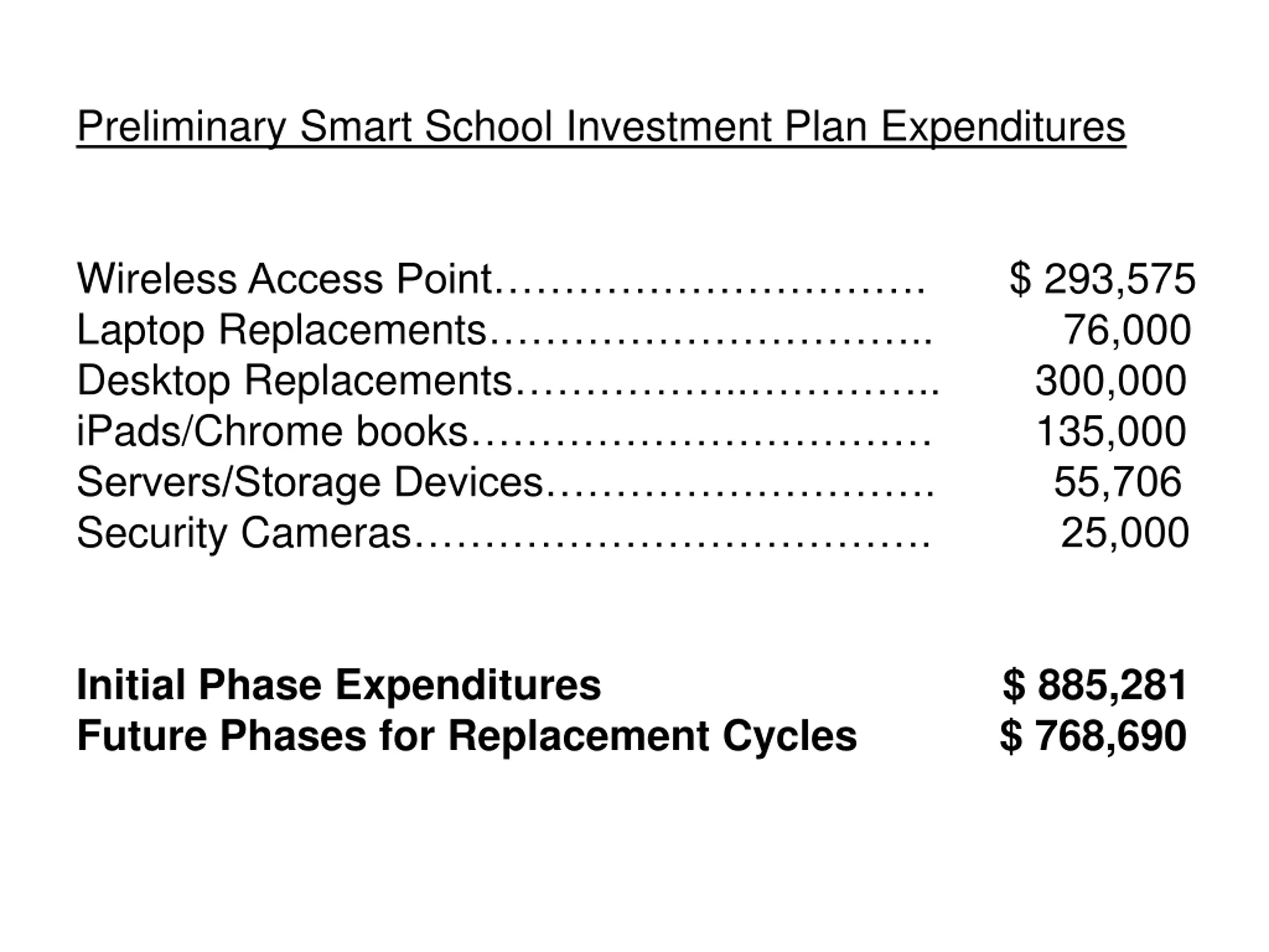 Preliminary Smart School Investment Plan Expenditures Wireless Access Point . $ 293,575 Laptop Replacements .. 76,000 Desktop Replacements .. .. 300,000 iPads/Chrome books 135,000 Servers/Storage Devices . 55,706 Security Cameras . 25,000 Initial Phase Expenditures Future Phases for Replacement Cycles $ 885,281 $ 768,690