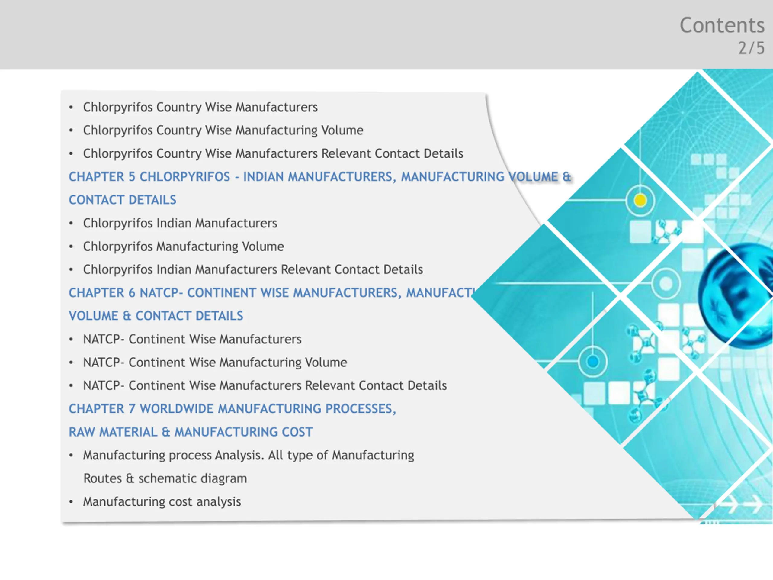 Contents 2/5 Chlorpyrifos Country Wise Manufacturers Chlorpyrifos Country Wise Manufacturing Volume Chlorpyrifos Country Wise Manufacturers Relevant Contact Details CHAPTER 5 CHLORPYRIFOS - INDIAN MANUFACTURERS, MANUFACTURING VOLUME & CONTACT DETAILS Chlorpyrifos Indian Manufacturers Chlorpyrifos Manufacturing Volume Chlorpyrifos Indian Manufacturers Relevant Contact Details CHAPTER 6 NATCP- CONTINENT WISE MANUFACTURERS, MANUFACTURING VOLUME & CONTACT DETAILS NATCP-Continent Wise Manufacturers NATCP-Continent Wise Manufacturing Volume NATCP-Continent Wise Manufacturers Relevant Contact Details CHAPTER 7 WORLDWIDE MANUFACTURING PROCESSES, RAW MATERIAL & MANUFACTURING COST Manufacturing process Analysis. All type of Manufacturing Routes & schematic diagram Manufacturing cost analysis