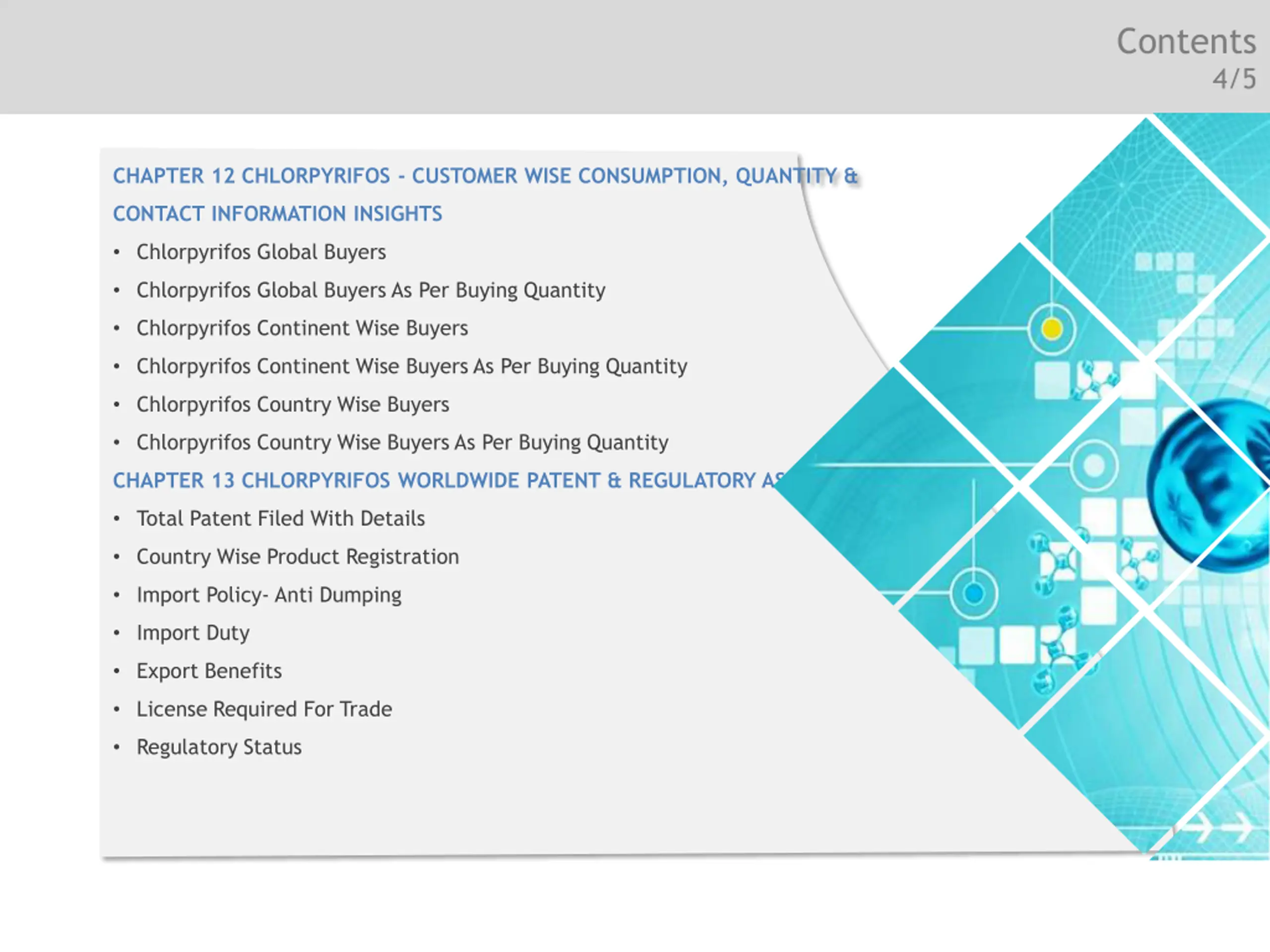 Contents 4/5 CHAPTER 12 CHLORPYRIFOS - CUSTOMER WISE CONSUMPTION, QUANTITY & CONTACT INFORMATION INSIGHTS Chlorpyrifos Global Buyers Chlorpyrifos Global Buyers As Per Buying Quantity Chlorpyrifos Continent Wise Buyers Chlorpyrifos Continent Wise Buyers As Per Buying Quantity Chlorpyrifos Country Wise Buyers Chlorpyrifos Country Wise Buyers As Per Buying Quantity CHAPTER 13 CHLORPYRIFOS WORLDWIDE PATENT & REGULATORY ASPECTS Total Patent Filed With Details Country Wise Product Registration Import Policy- Anti Dumping Import Duty Export Benefits License Required For Trade Regulatory Status