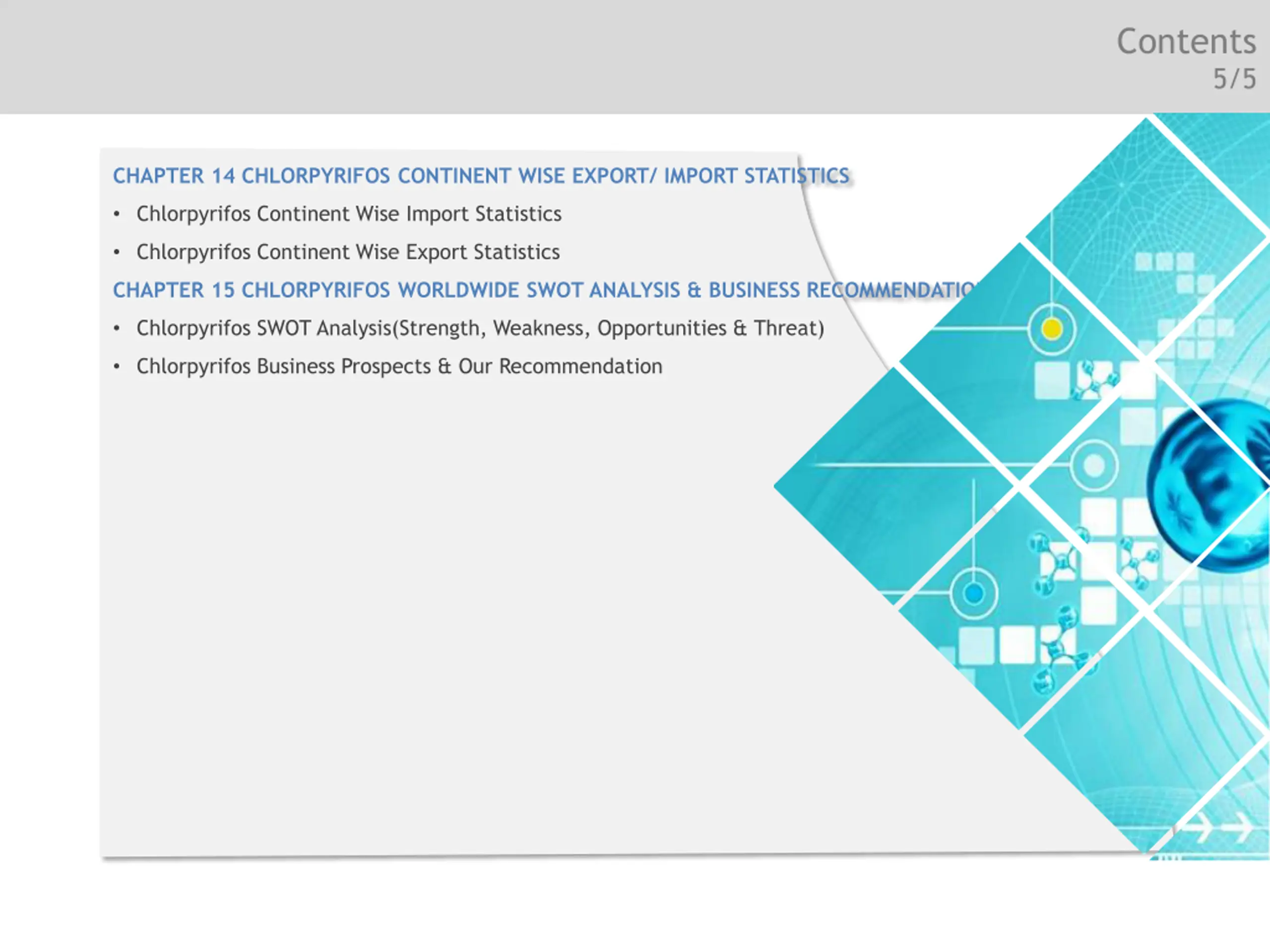 Contents 5/5 CHAPTER 14 CHLORPYRIFOS CONTINENT WISE EXPORT/ IMPORT STATISTICS Chlorpyrifos Continent Wise Import Statistics Chlorpyrifos Continent Wise Export Statistics CHAPTER 15 CHLORPYRIFOS WORLDWIDE SWOT ANALYSIS & BUSINESS RECOMMENDATION Chlorpyrifos SWOT Analysis(Strength, Weakness, Opportunities & Threat) Chlorpyrifos Business Prospects & Our Recommendation