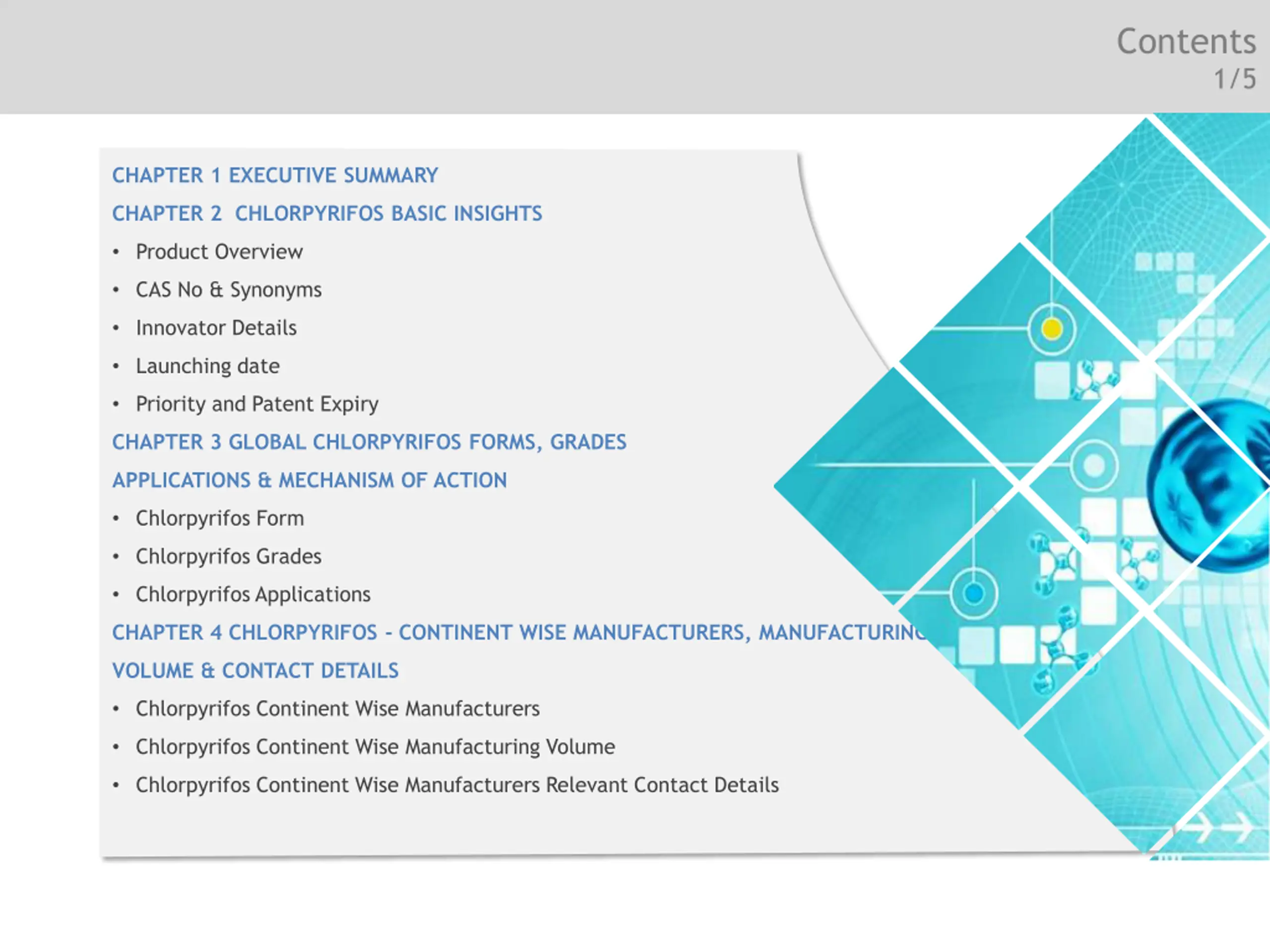 Contents 1/5 CHAPTER 1 EXECUTIVE SUMMARY CHAPTER 2 CHLORPYRIFOS BASIC INSIGHTS Product Overview CAS No & Synonyms Innovator Details Launching date Priority and Patent Expiry CHAPTER 3 GLOBAL CHLORPYRIFOS FORMS, GRADES APPLICATIONS & MECHANISM OF ACTION Chlorpyrifos Form Chlorpyrifos Grades Chlorpyrifos Applications CHAPTER 4 CHLORPYRIFOS - CONTINENT WISE MANUFACTURERS, MANUFACTURING VOLUME & CONTACT DETAILS Chlorpyrifos Continent Wise Manufacturers Chlorpyrifos Continent Wise Manufacturing Volume Chlorpyrifos Continent Wise Manufacturers Relevant Contact Details