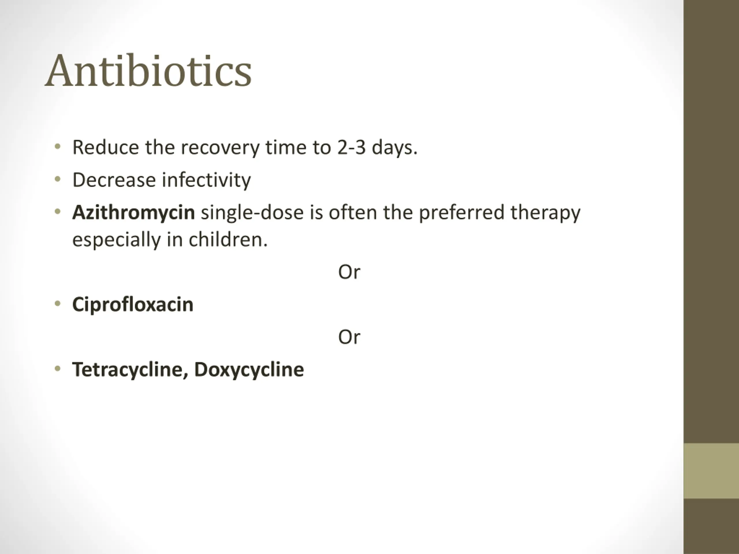 Antibiotics Reduce the recovery time to 2-3 days. Decrease infectivity Azithromycin single-dose is often the preferred therapy especially in children. Or Ciprofloxacin Or Tetracycline, Doxycycline