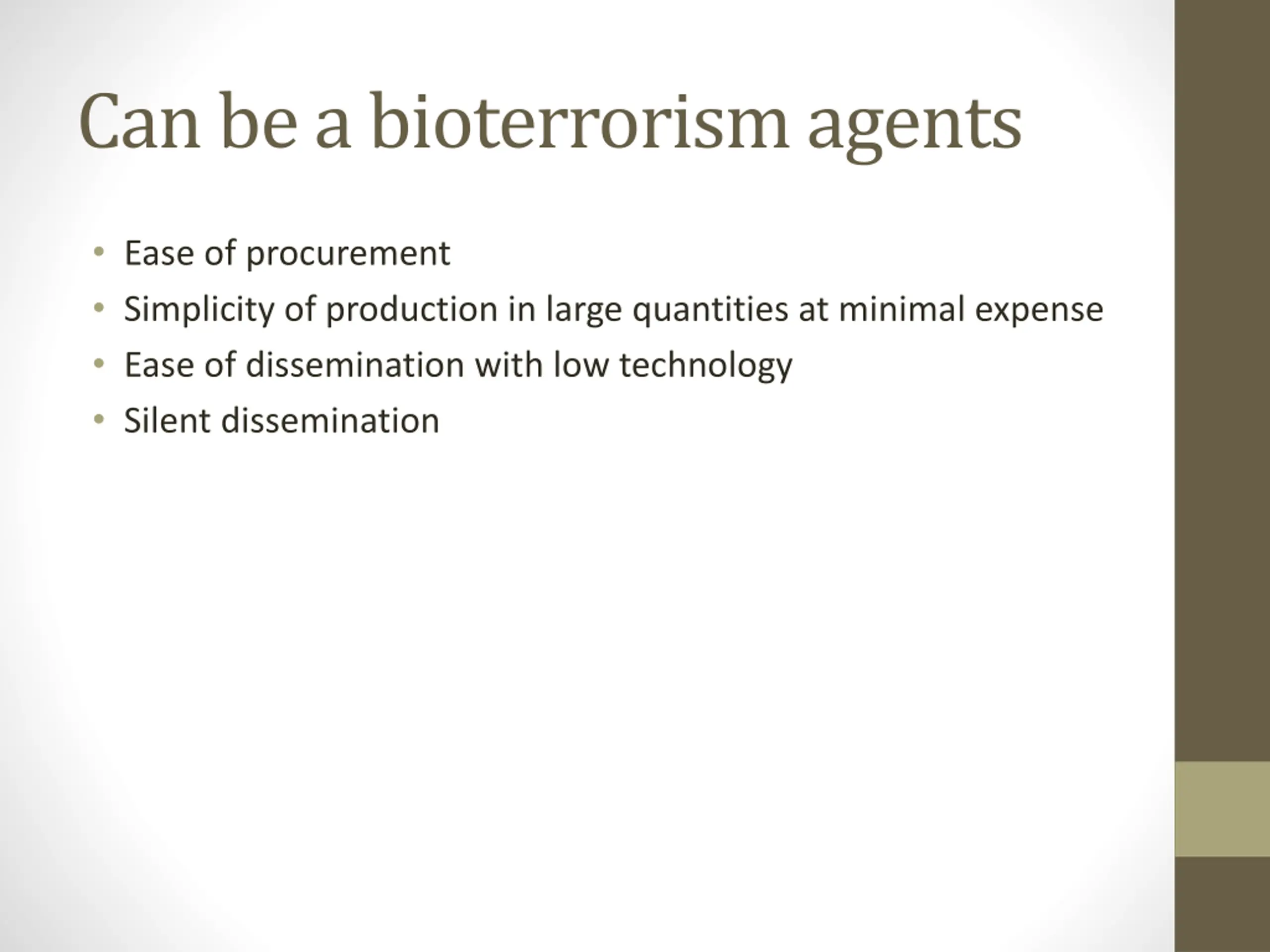 Can be a bioterrorism agents Ease of procurement Simplicity of production in large quantities at minimal expense Ease of dissemination with low technology Silent dissemination