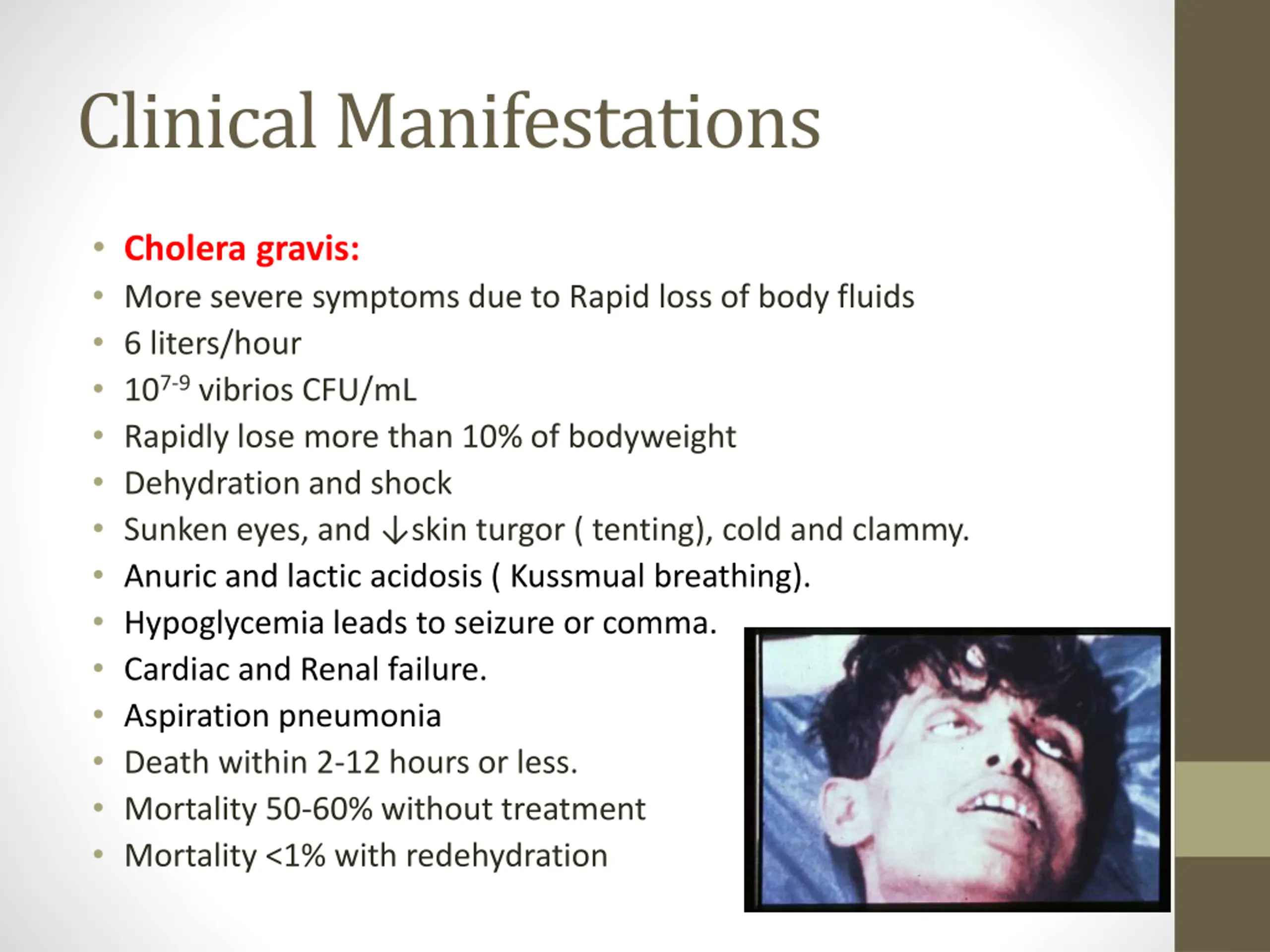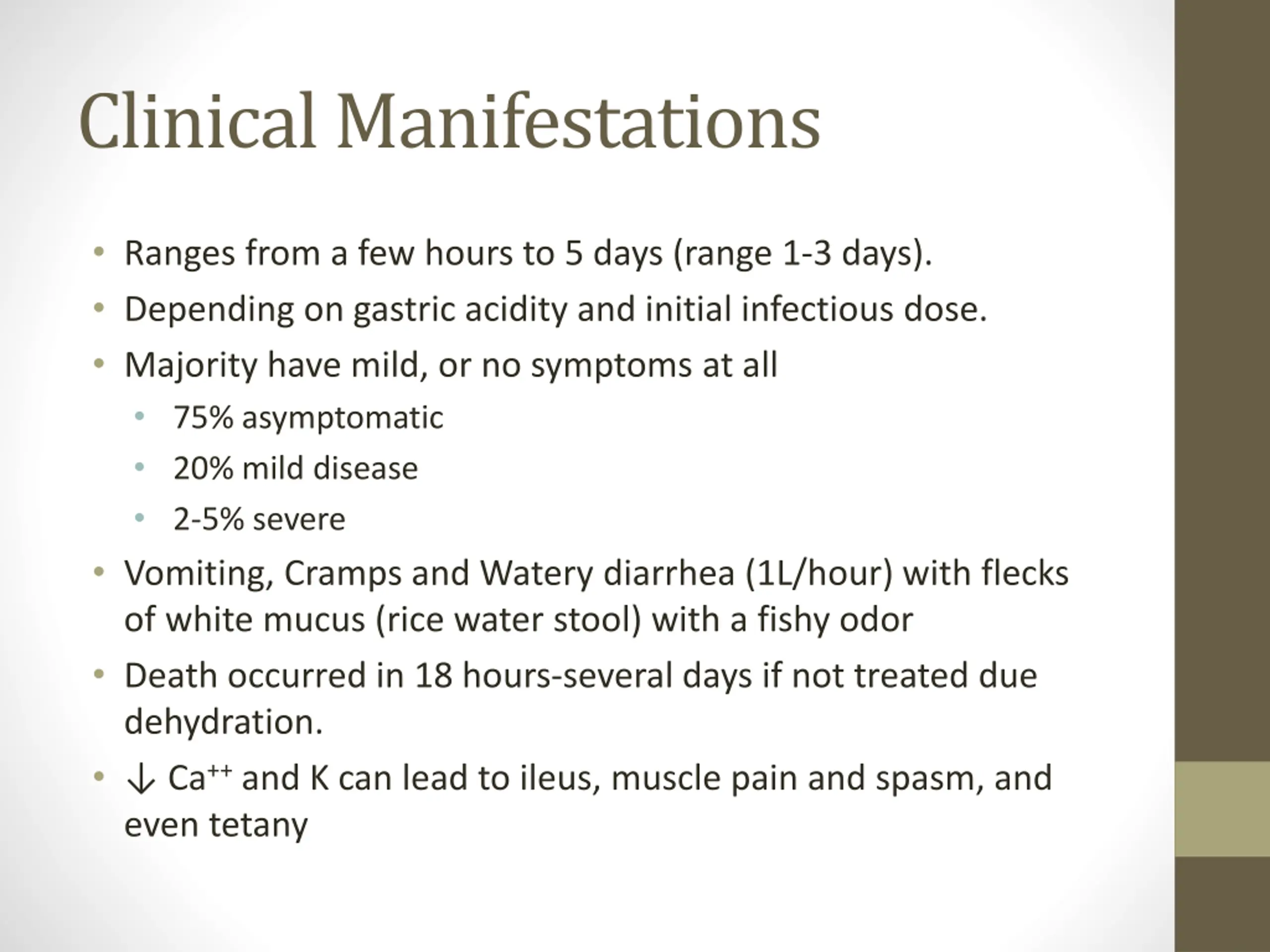Clinical Manifestations Ranges from a few hours to 5 days (range 1-3 days). Depending on gastric acidity and initial infectious dose. Majority have mild, or no symptoms at all 75% asymptomatic 20% mild disease 2-5% severe Vomiting, Cramps and Watery diarrhea (1L/hour) with flecks of white mucus (rice water stool) with a fishy odor Death occurred in 18 hours-several days if not treated due dehydration. Ca++ and K can lead to ileus, muscle pain and spasm, and even tetany