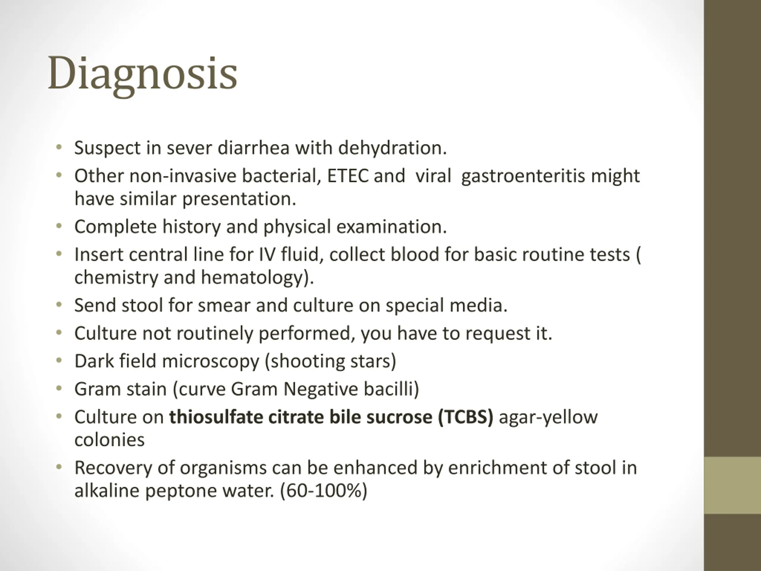 Diagnosis Suspect in sever diarrhea with dehydration. Other non-invasive bacterial, ETEC and viral gastroenteritis might have similar presentation. Complete history and physical examination. Insert central line for IV fluid, collect blood for basic routine tests ( chemistry and hematology). Send stool for smear and culture on special media. Culture not routinely performed, you have to request it. Dark field microscopy (shooting stars) Gram stain (curve Gram Negative bacilli) Culture on thiosulfate citrate bile sucrose (TCBS) agar-yellow colonies Recovery of organisms can be enhanced by enrichment of stool in alkaline peptone water. (60-100%)