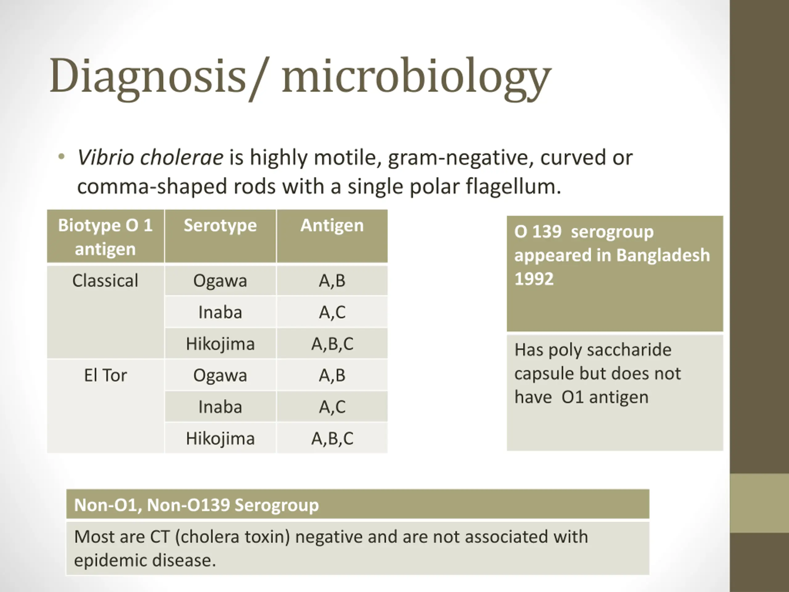 Diagnosis/ microbiology Vibrio cholerae is highly motile, gram-negative, curved or comma-shaped rods with a single polar flagellum. Biotype O 1 antigen Serotype Antigen O 139 serogroup appeared in Bangladesh 1992 Classical Ogawa A,B Inaba A,C Hikojima A,B,C Has poly saccharide capsule but does not have O1 antigen El Tor Ogawa A,B Inaba A,C Hikojima A,B,C Non-O1, Non-O139 Serogroup Most are CT (cholera toxin) negative and are not associated with epidemic disease.