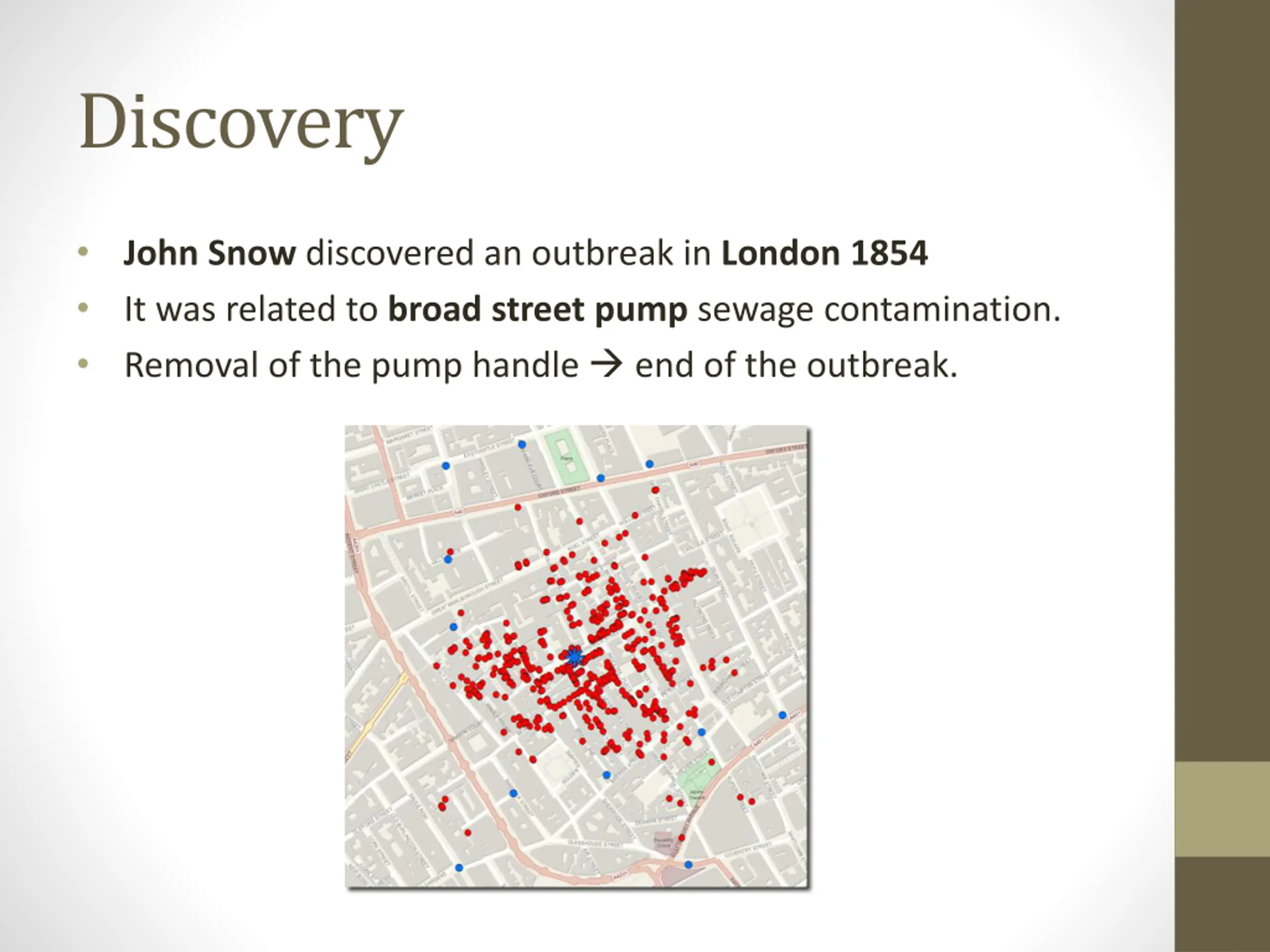 Discovery John Snow discovered an outbreak in London 1854 It was related to broad street pump sewage contamination. Removal of the pump handle end of the outbreak.