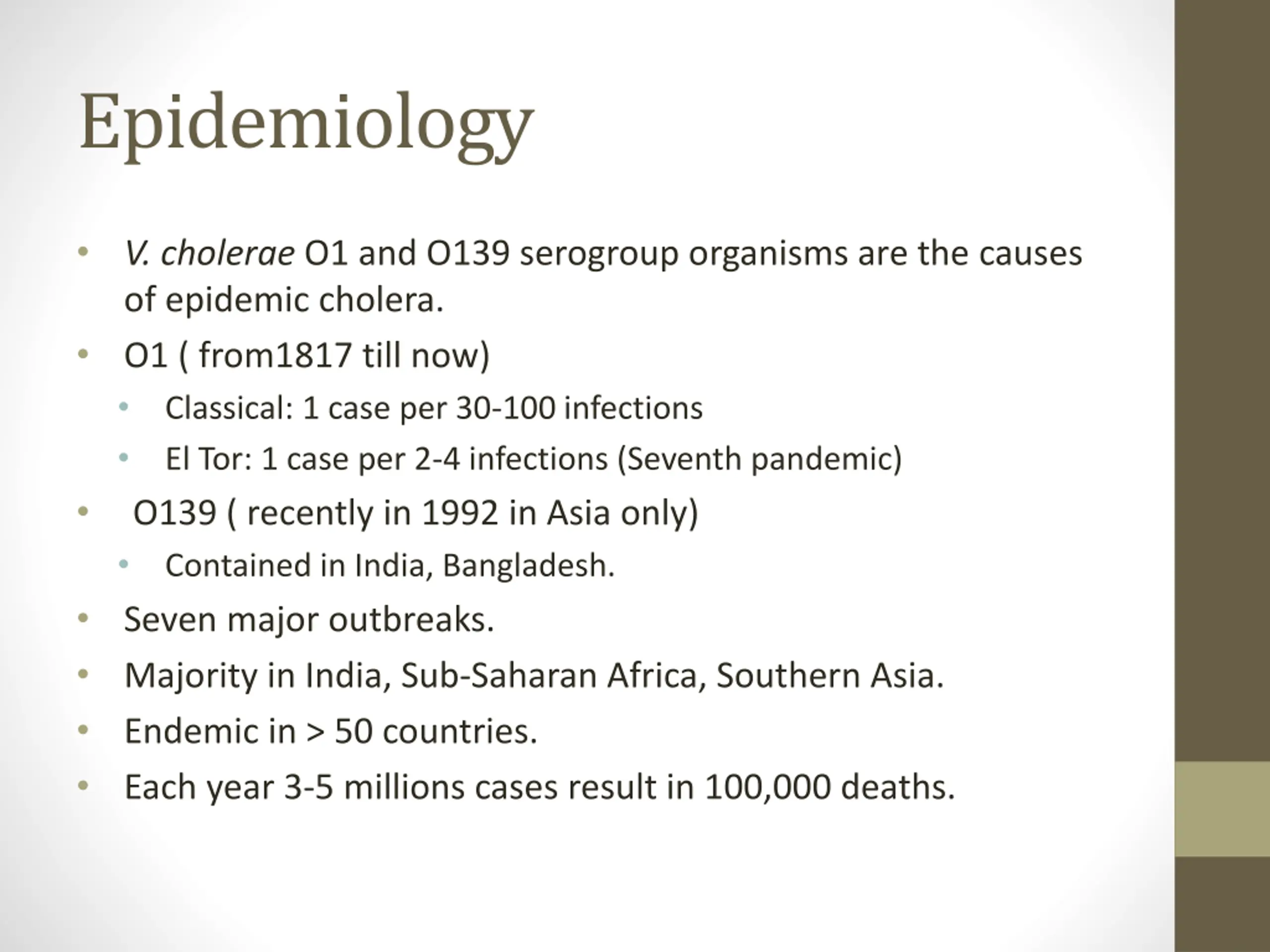 Epidemiology V. cholerae O1 and O139 serogroup organisms are the causes of epidemic cholera. O1 ( from1817 till now) Classical: 1 case per 30-100 infections El Tor: 1 case per 2-4 infections (Seventh pandemic) O139 ( recently in 1992 in Asia only) Contained in India, Bangladesh. Seven major outbreaks. Majority in India, Sub-Saharan Africa, Southern Asia. Endemic in > 50 countries. Each year 3-5 millions cases result in 100,000 deaths.