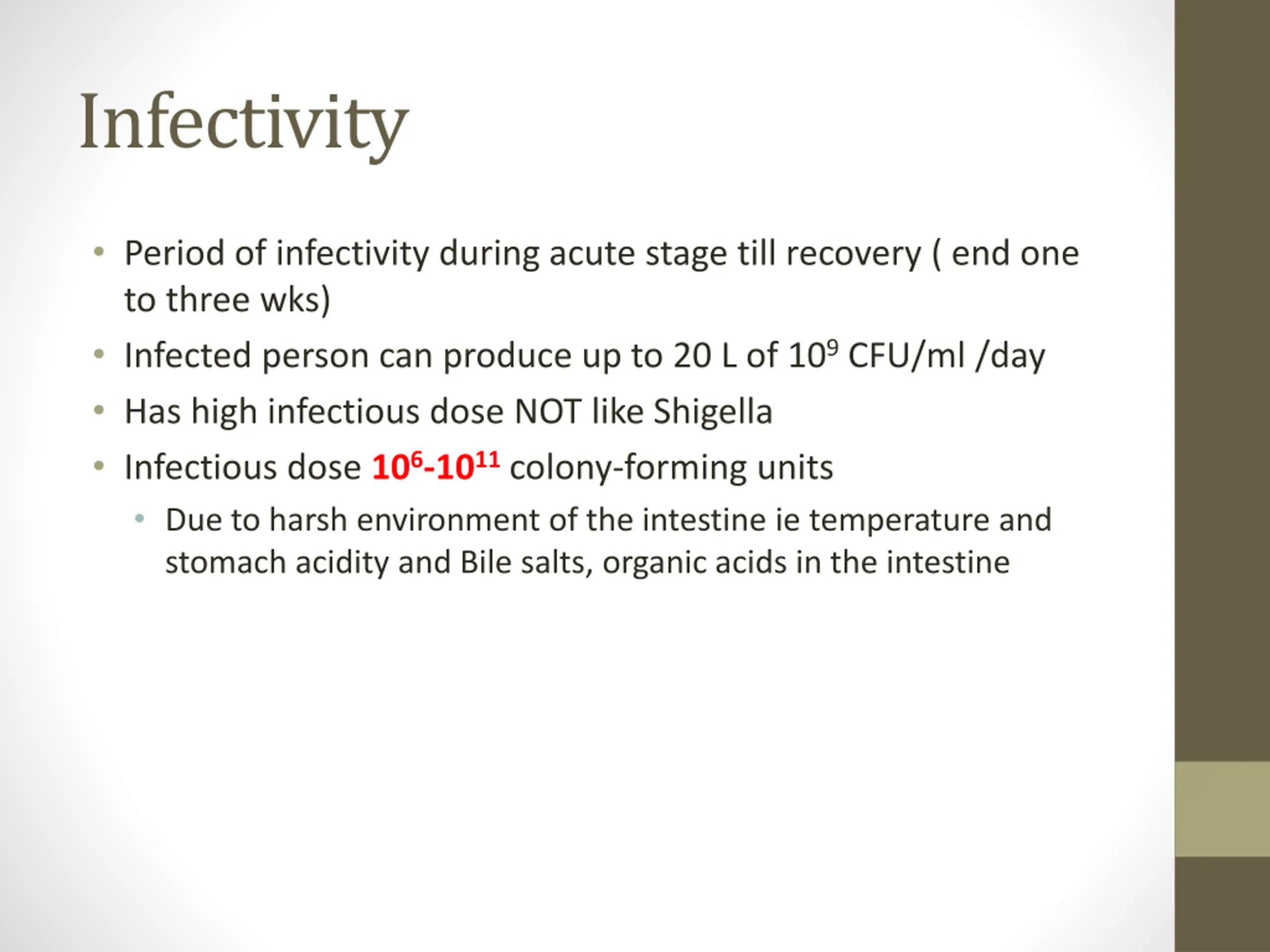 Infectivity Period of infectivity during acute stage till recovery ( end one to three wks) Infected person can produce up to 20 L of 109CFU/ml /day Has high infectious dose NOT like Shigella Infectious dose 106-1011colony-forming units Due to harsh environment of the intestine ie temperature and stomach acidity and Bile salts, organic acids in the intestine