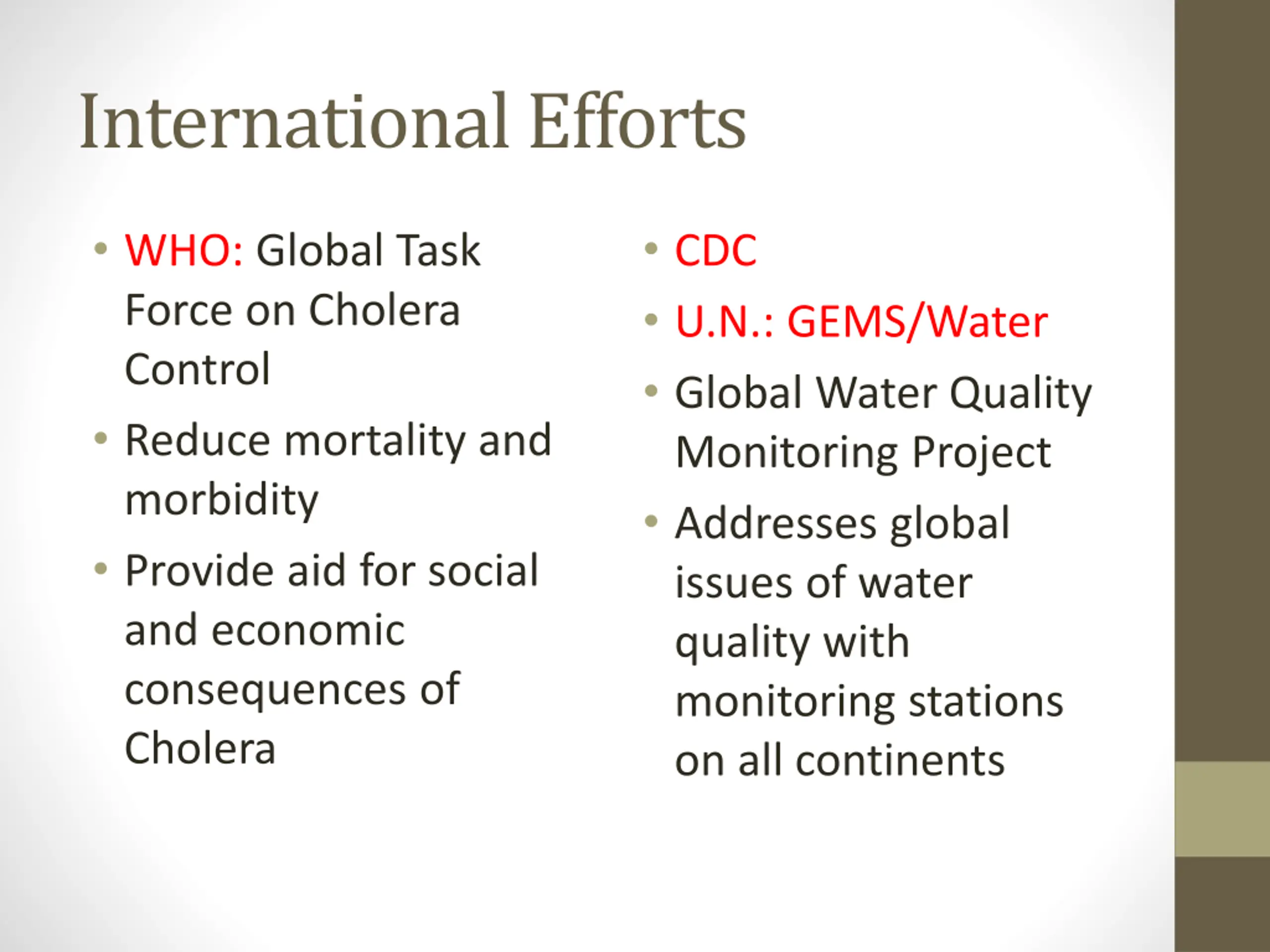 International Efforts WHO: Global Task Force on Cholera Control Reduce mortality and morbidity Provide aid for social and economic consequences of Cholera CDC U.N.: GEMS/Water Global Water Quality Monitoring Project Addresses global issues of water quality with monitoring stations on all continents
