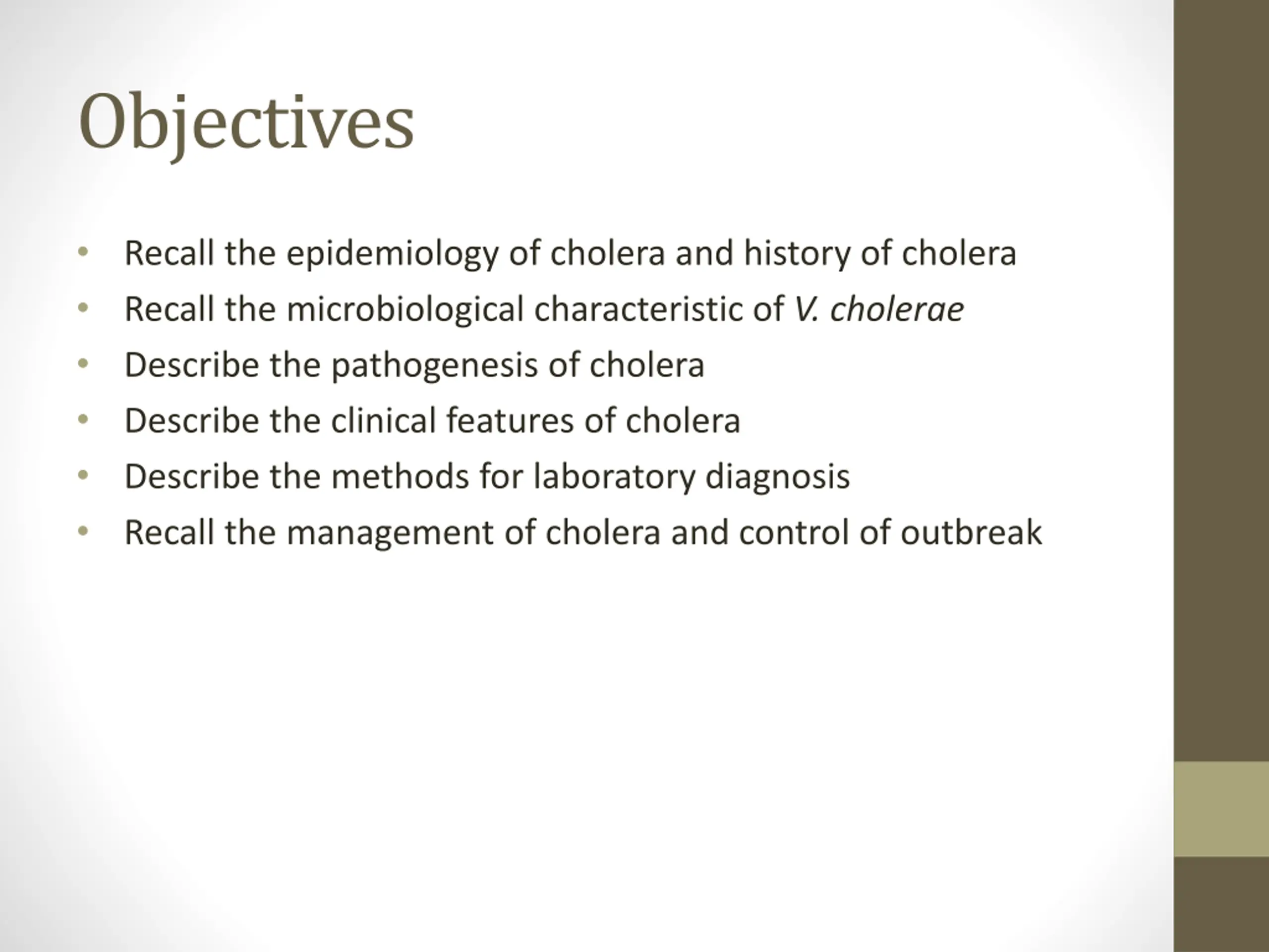 Objectives Recall the epidemiology of cholera and history of cholera Recall the microbiological characteristic of V. cholerae Describe the pathogenesis of cholera Describe the clinical features of cholera Describe the methods for laboratory diagnosis Recall the management of cholera and control of outbreak