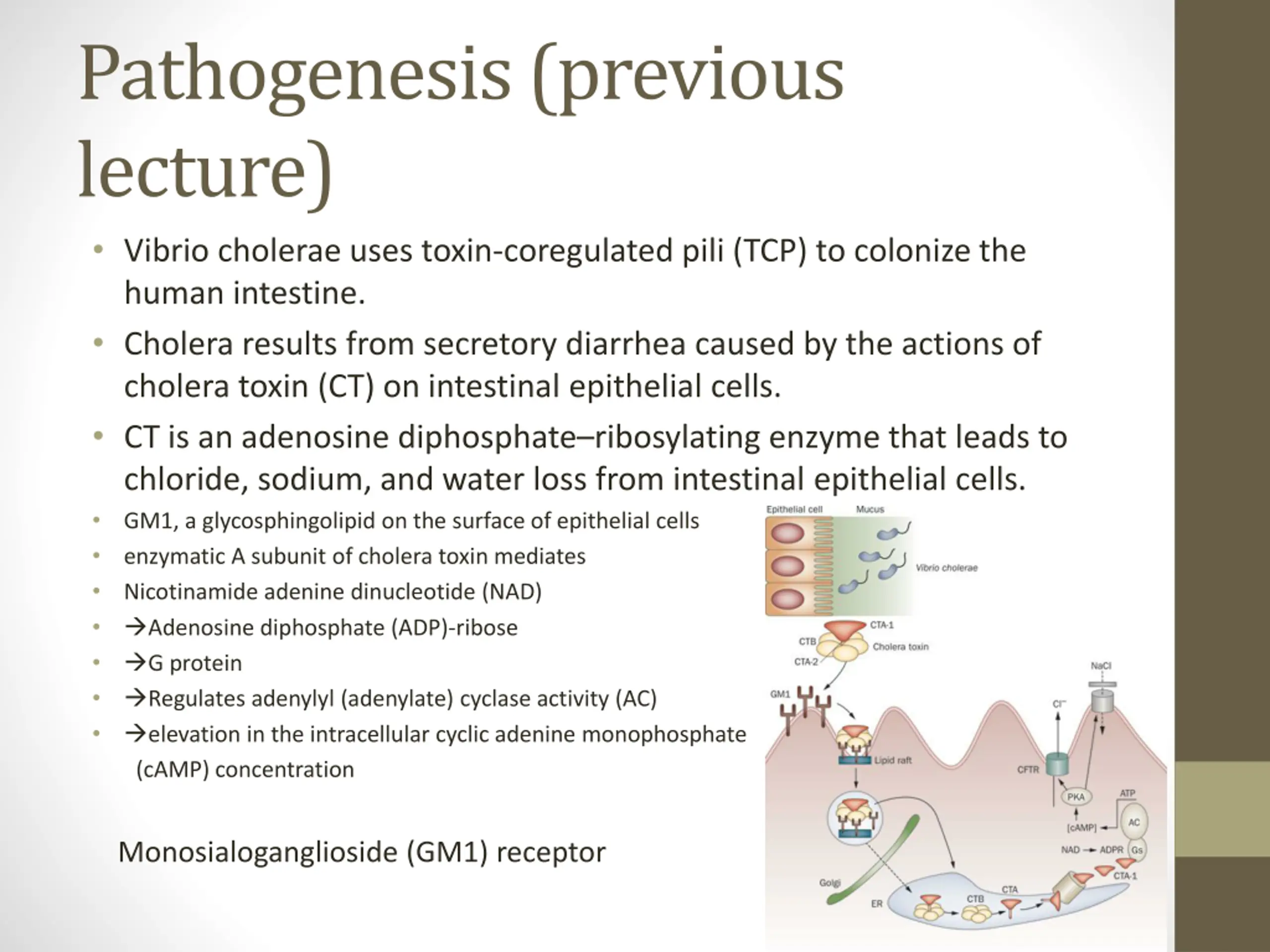 Pathogenesis (previous lecture) Vibrio cholerae uses toxin-coregulated pili (TCP) to colonize the human intestine. Cholera results from secretory diarrhea caused by the actions of cholera toxin (CT) on intestinal epithelial cells. CT is an adenosine diphosphate ribosylating enzyme that leads to chloride, sodium, and water loss from intestinal epithelial cells. GM1, a glycosphingolipid on the surface of epithelial cells enzymatic A subunit of cholera toxin mediates Nicotinamide adenine dinucleotide (NAD) Adenosine diphosphate (ADP)-ribose G protein Regulates adenylyl (adenylate) cyclase activity (AC) elevation in the intracellular cyclic adenine monophosphate (cAMP) concentration Monosialoganglioside (GM1) receptor