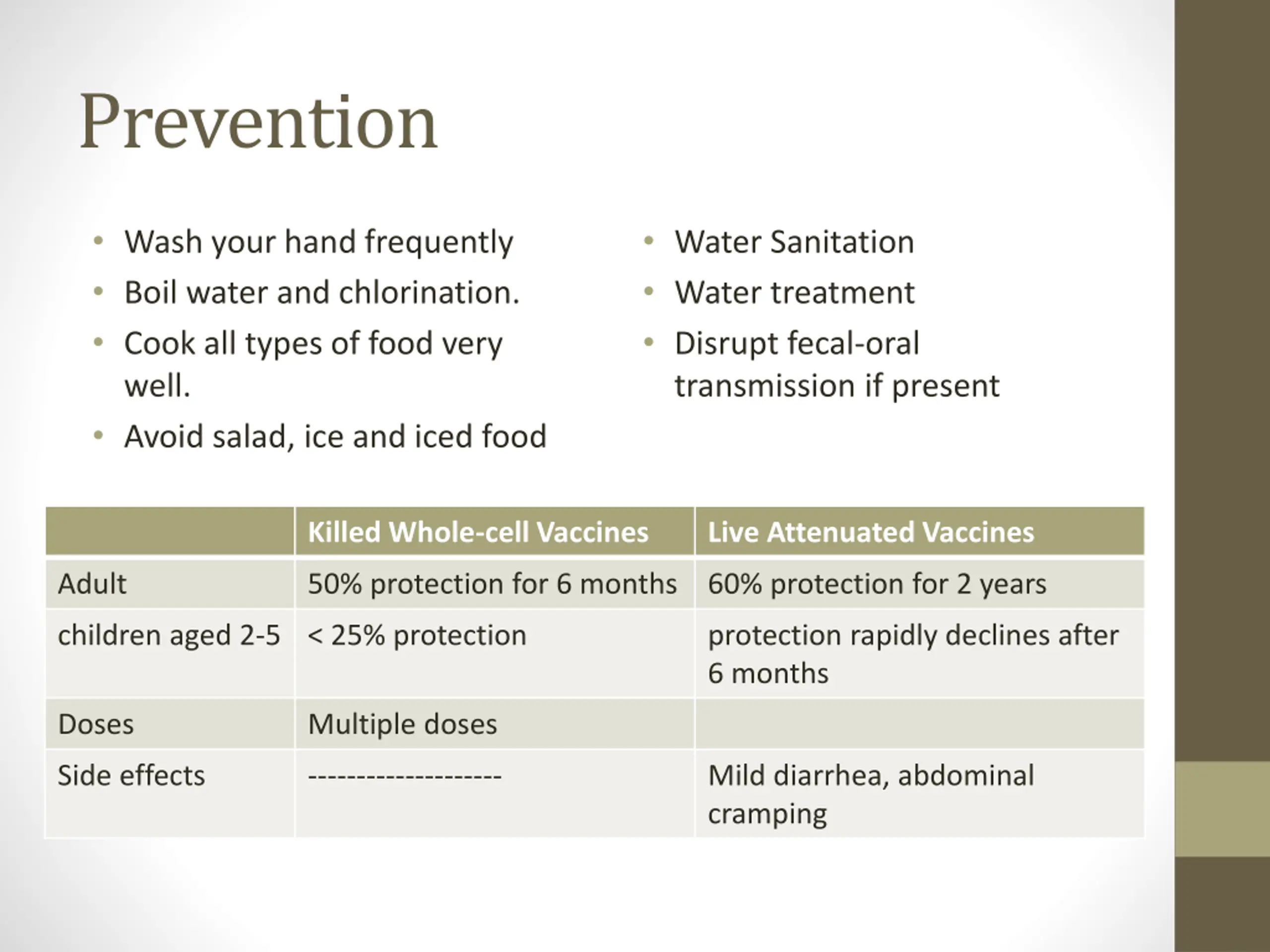 Prevention Wash your hand frequently Boil water and chlorination. Cook all types of food very well. Avoid salad, ice and iced food Water Sanitation Water treatment Disrupt fecal-oral transmission if present Killed Whole-cell Vaccines Live Attenuated Vaccines Adult 50% protection for 6 months 60% protection for 2 years children aged 2-5 < 25% protection protection rapidly declines after 6 months Doses Multiple doses Side effects -------------------- Mild diarrhea, abdominal cramping