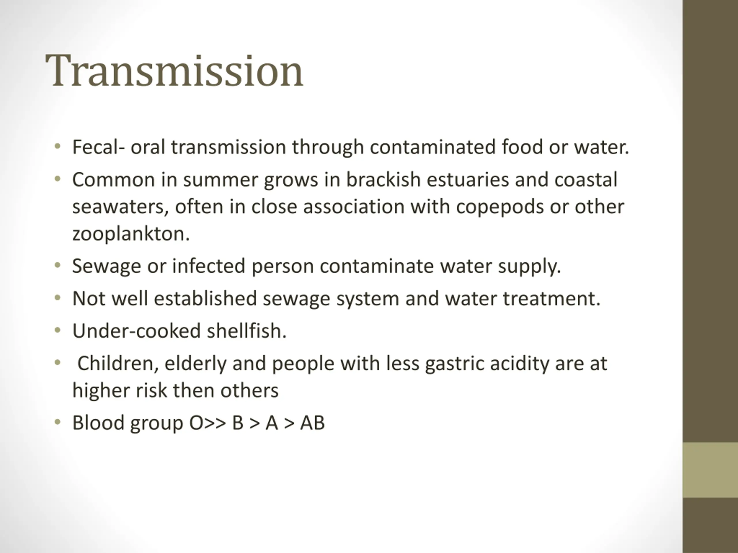 Transmission Fecal- oral transmission through contaminated food or water. Common in summer grows in brackish estuaries and coastal seawaters, often in close association with copepods or other zooplankton. Sewage or infected person contaminate water supply. Not well established sewage system and water treatment. Under-cooked shellfish. Children, elderly and people with less gastric acidity are at higher risk then others Blood group O>> B > A > AB