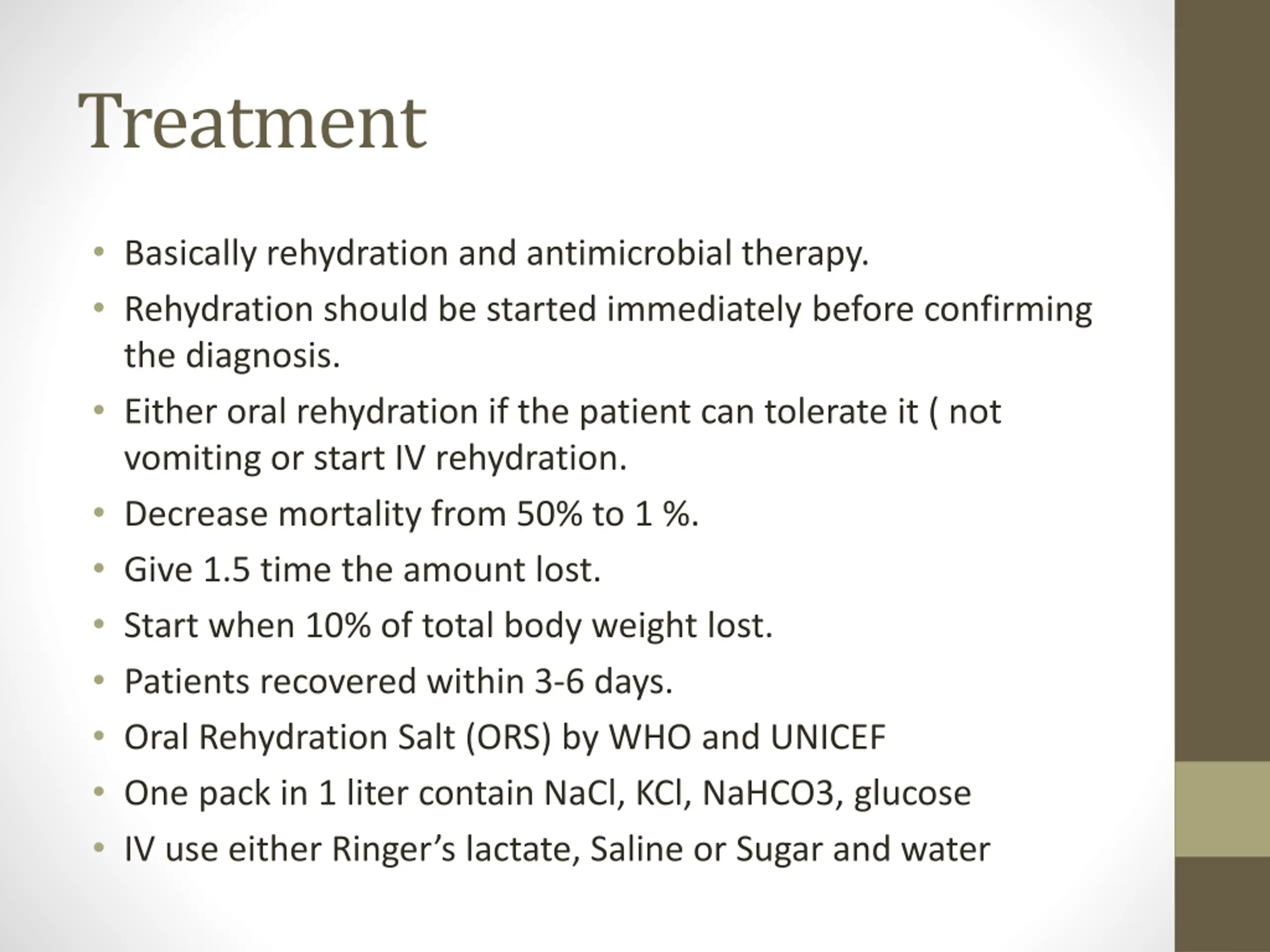 Treatment Basically rehydration and antimicrobial therapy. Rehydration should be started immediately before confirming the diagnosis. Either oral rehydration if the patient can tolerate it ( not vomiting or start IV rehydration. Decrease mortality from 50% to 1 %. Give 1.5 time the amount lost. Start when 10% of total body weight lost. Patients recovered within 3-6 days. Oral Rehydration Salt (ORS) by WHO and UNICEF One pack in 1 liter contain NaCl, KCl, NaHCO3, glucose IV use either Ringer s lactate, Saline or Sugar and water