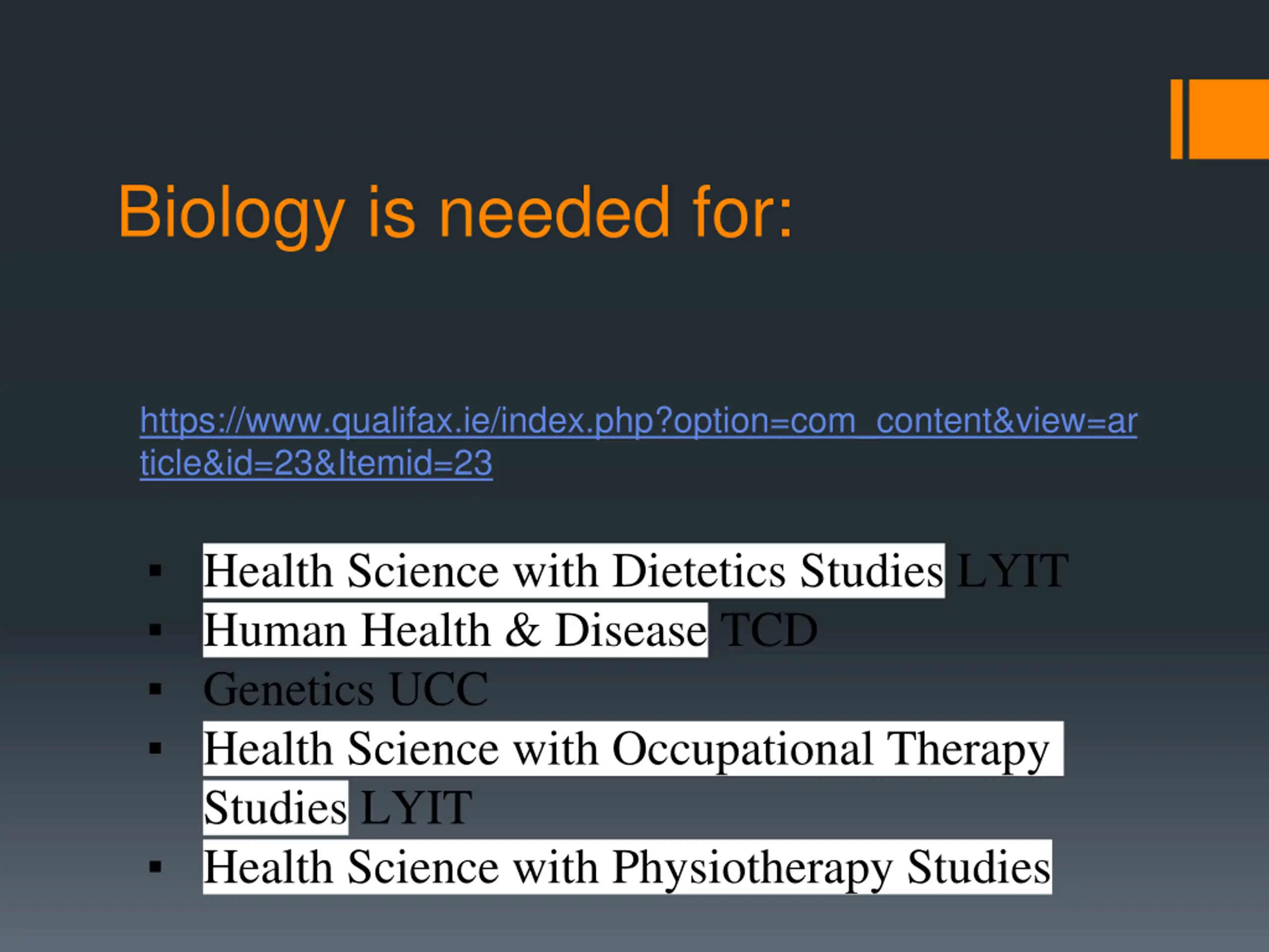Biology is needed for: https://www.qualifax.ie/index.php?option=com_content&view=ar ticle&id=23&Itemid=23 Health Science with Dietetics Studies LYIT Human Health & Disease TCD Genetics UCC Health Science with Occupational Therapy Studies LYIT Health Science with Physiotherapy Studies
