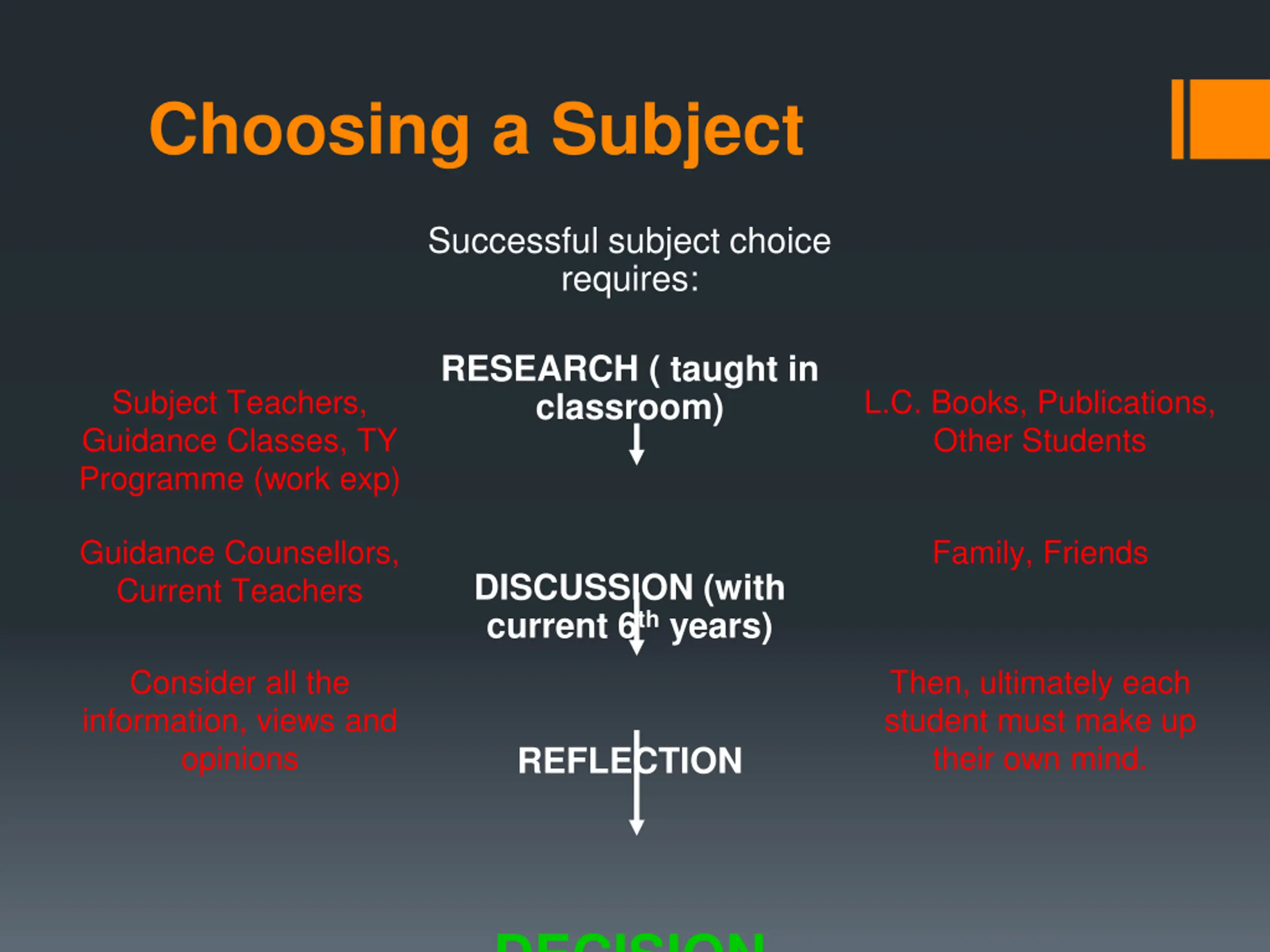 Choosing a Subject Successful subject choice requires: RESEARCH ( taught in classroom) Subject Teachers, Guidance Classes, TY Programme (work exp) L.C. Books, Publications, Other Students Guidance Counsellors, Current Teachers Family, Friends DISCUSSION (with current 6thyears) Consider all the information, views and opinions Then, ultimately each student must make up their own mind. REFLECTION DECISION
