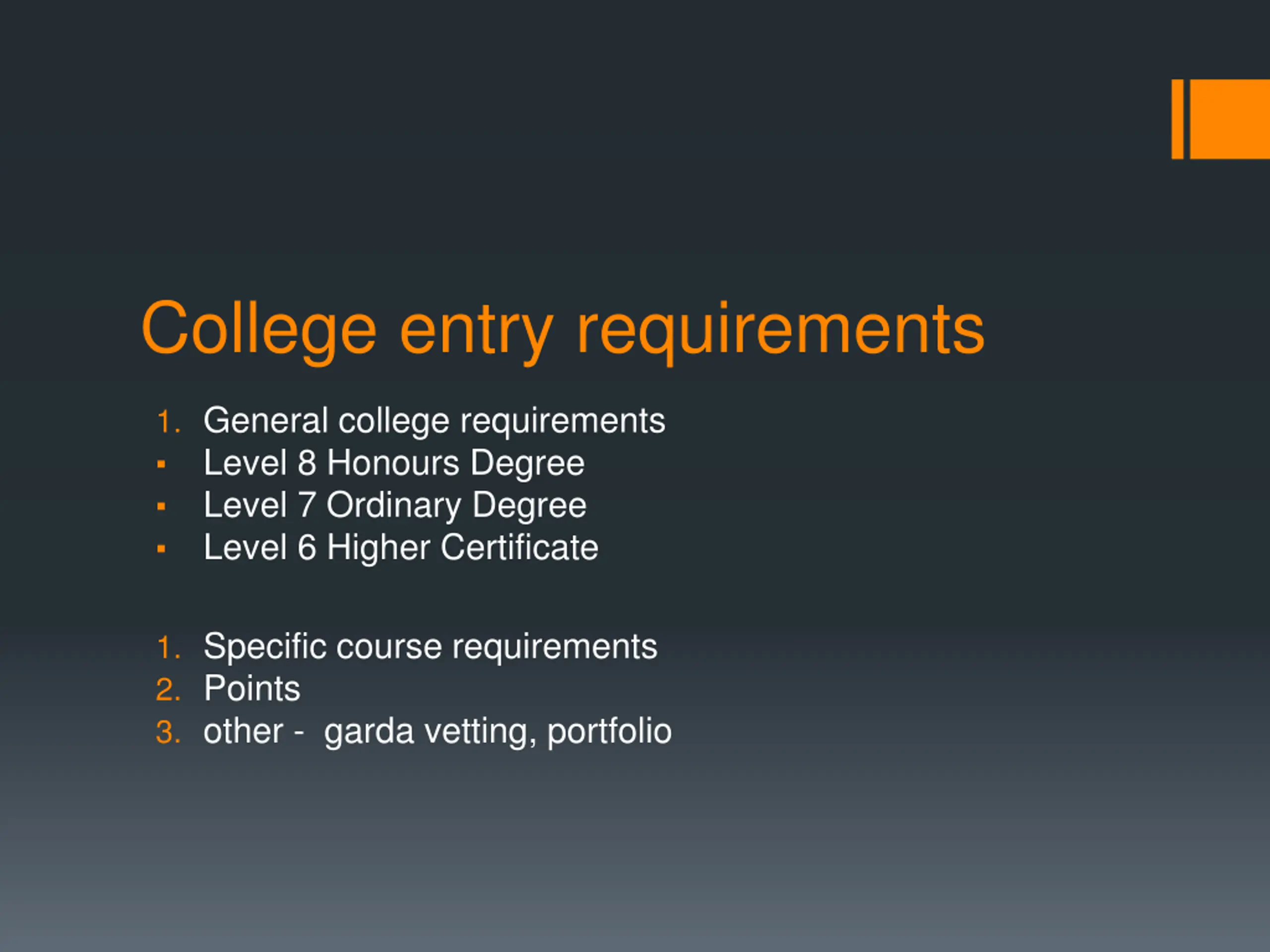 College entry requirements 1. General college requirements Level 8 Honours Degree Level 7 Ordinary Degree Level 6 Higher Certificate 1. Specific course requirements 2. Points 3. other - garda vetting, portfolio