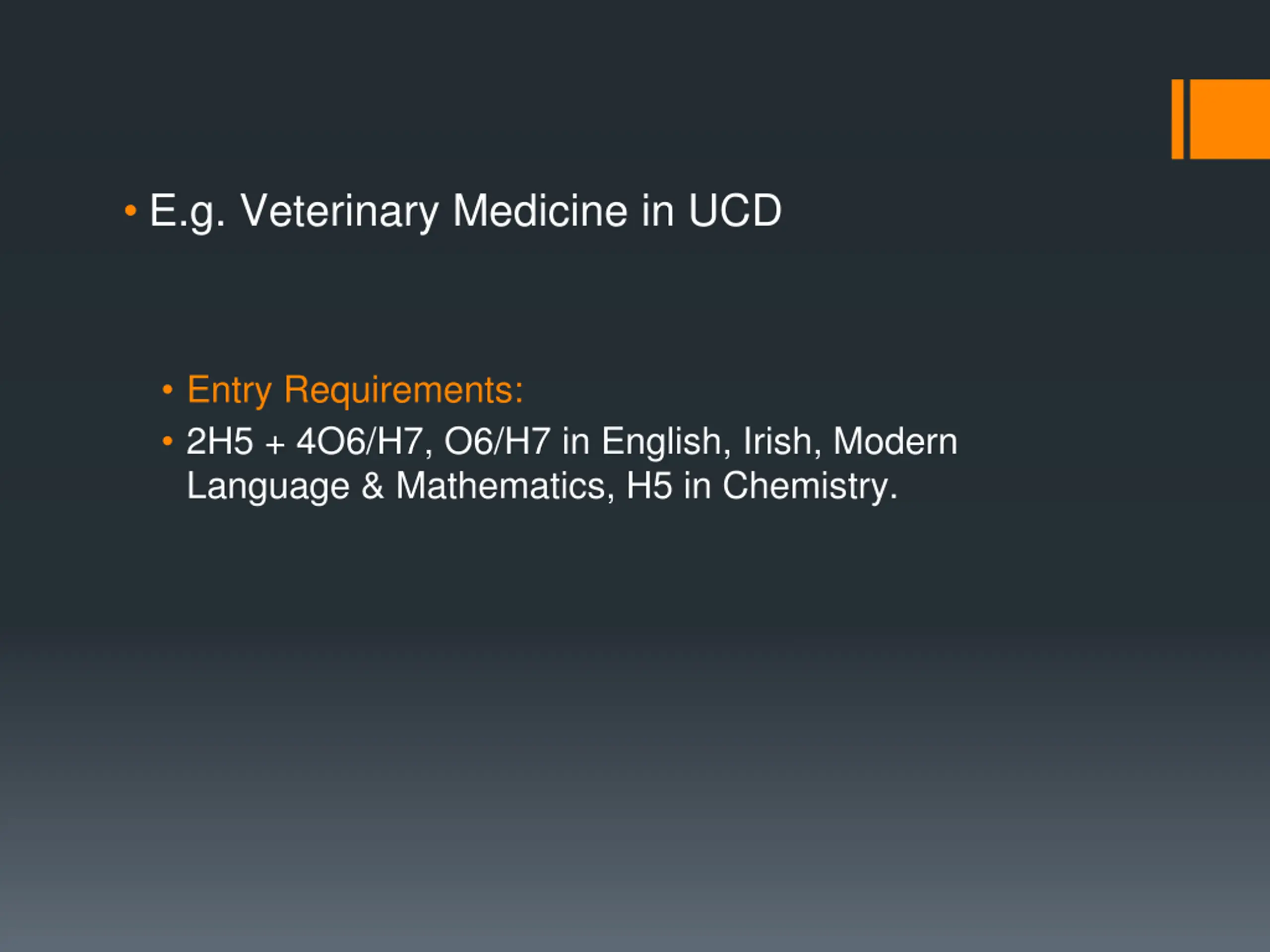 E.g. Veterinary Medicine in UCD Entry Requirements: 2H5 + 4O6/H7, O6/H7 in English, Irish, Modern Language & Mathematics, H5 in Chemistry.