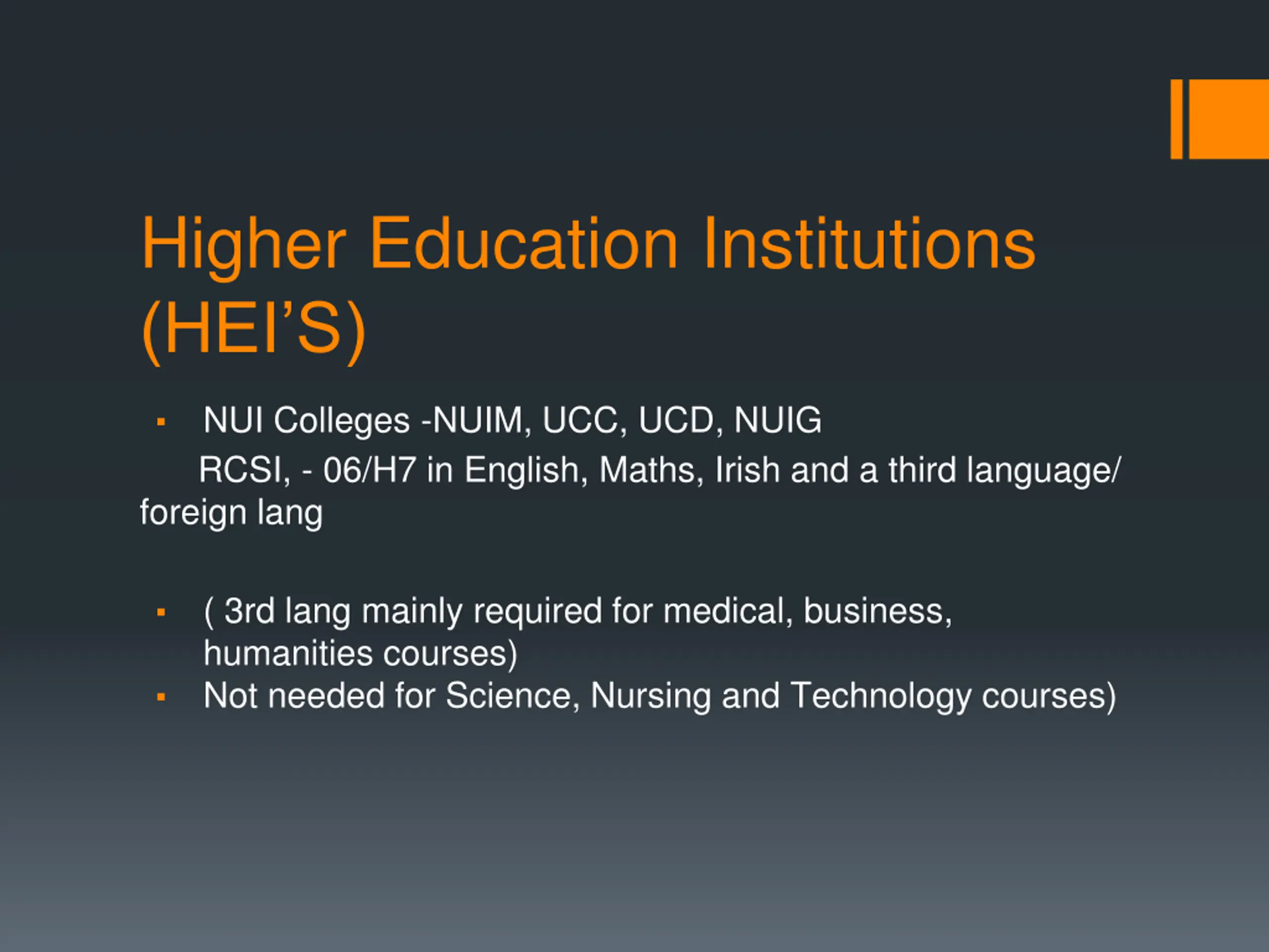 Higher Education Institutions (HEI S) NUI Colleges -NUIM, UCC, UCD, NUIG RCSI, - 06/H7 in English, Maths, Irish and a third language/ foreign lang ( 3rd lang mainly required for medical, business, humanities courses) Not needed for Science, Nursing and Technology courses)