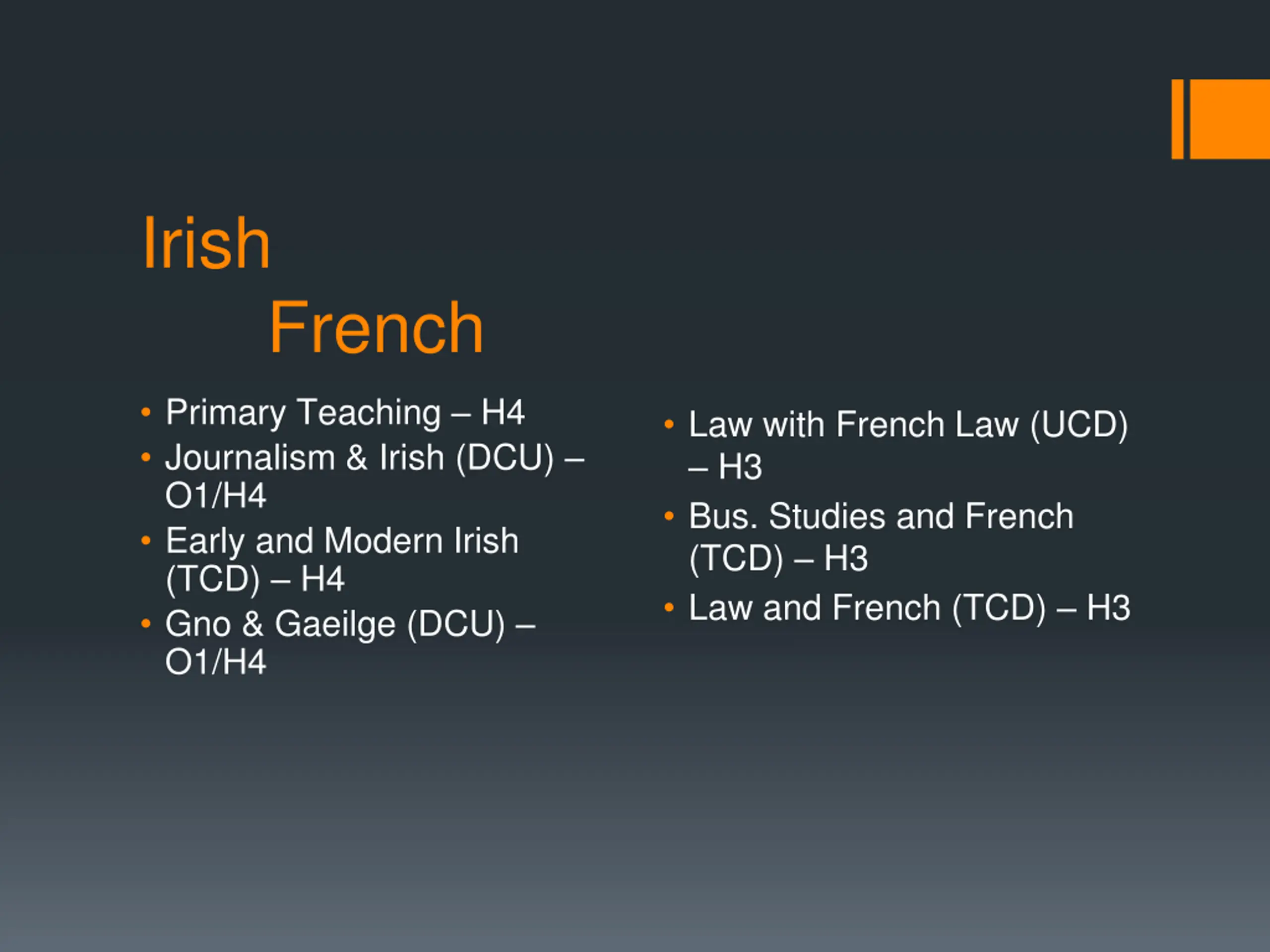Irish French Primary Teaching H4 Journalism & Irish (DCU) O1/H4 Early and Modern Irish (TCD) H4 Gno & Gaeilge (DCU) O1/H4 Law with French Law (UCD) H3 Bus. Studies and French (TCD) H3 Law and French (TCD) H3