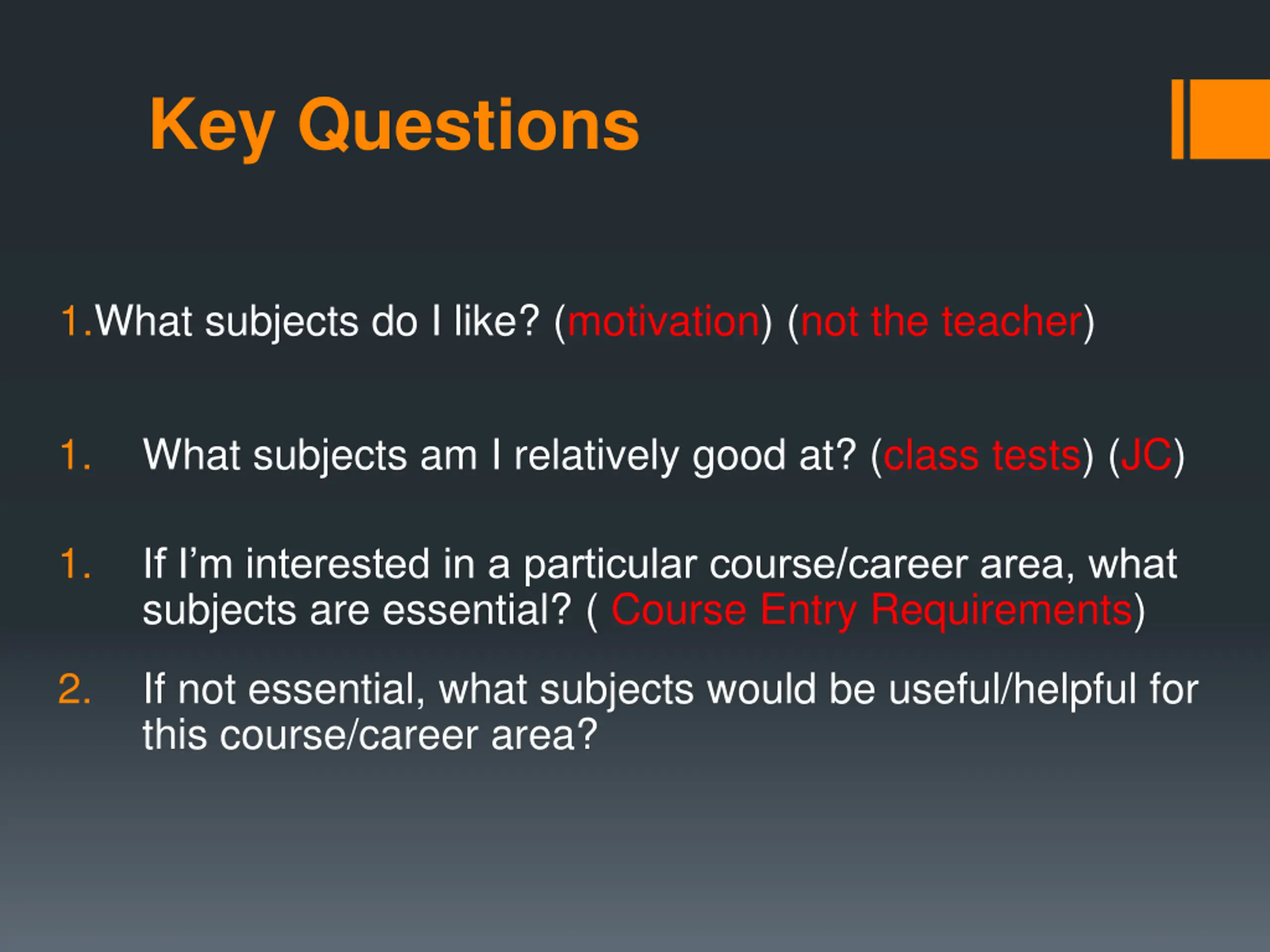 Key Questions 1.What subjects do I like? (motivation) (not the teacher) 1. What subjects am I relatively good at? (class tests) (JC) 1. If I m interested in a particular course/career area, what subjects are essential? ( Course Entry Requirements) 2. If not essential, what subjects would be useful/helpful for this course/career area?