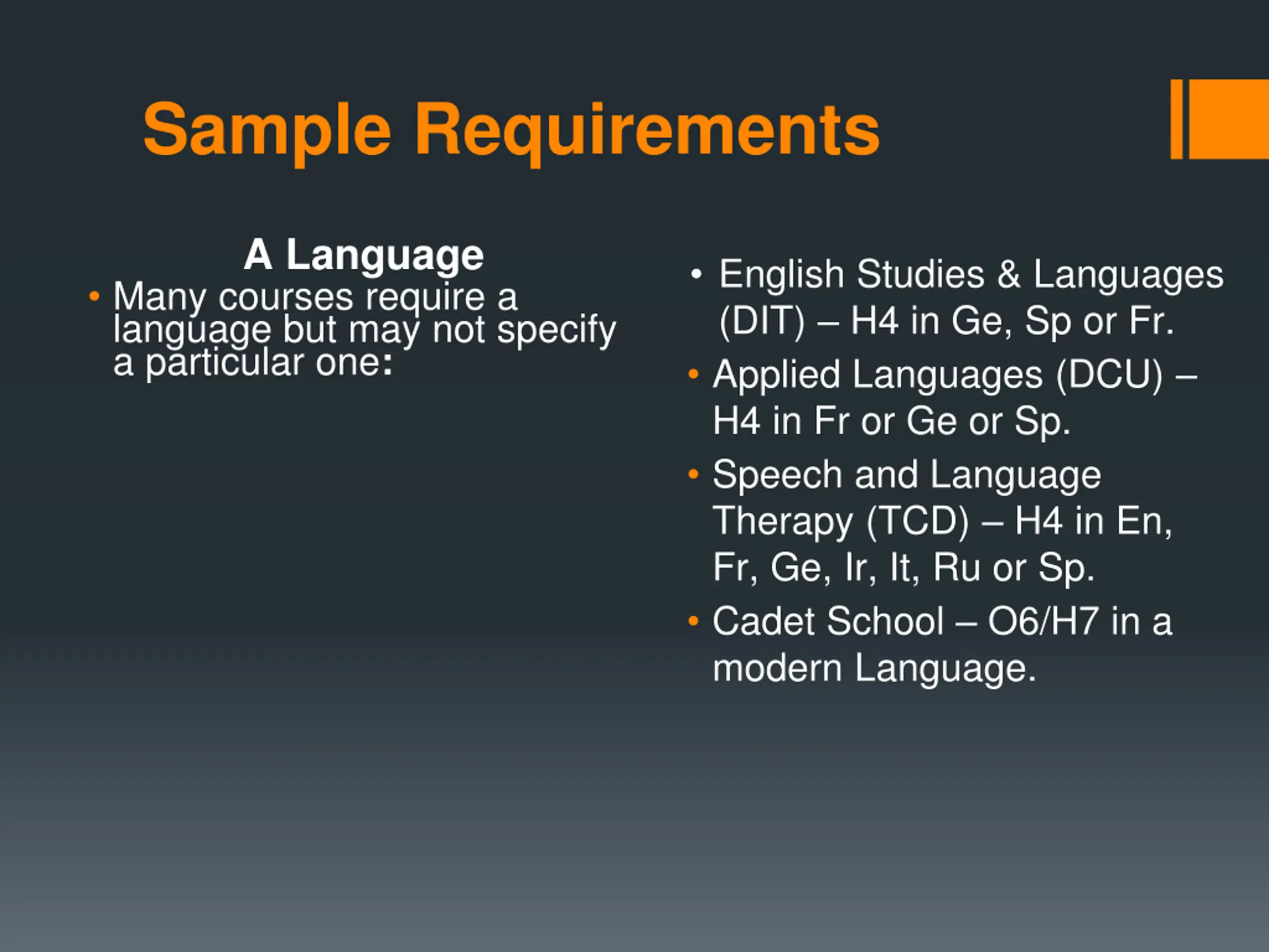 Sample Requirements A Language English Studies & Languages (DIT) H4 in Ge, Sp or Fr. Applied Languages (DCU) H4 in Fr or Ge or Sp. Speech and Language Therapy (TCD) H4 in En, Fr, Ge, Ir, It, Ru or Sp. Cadet School O6/H7 in a modern Language. Many courses require a language but may not specify a particular one:
