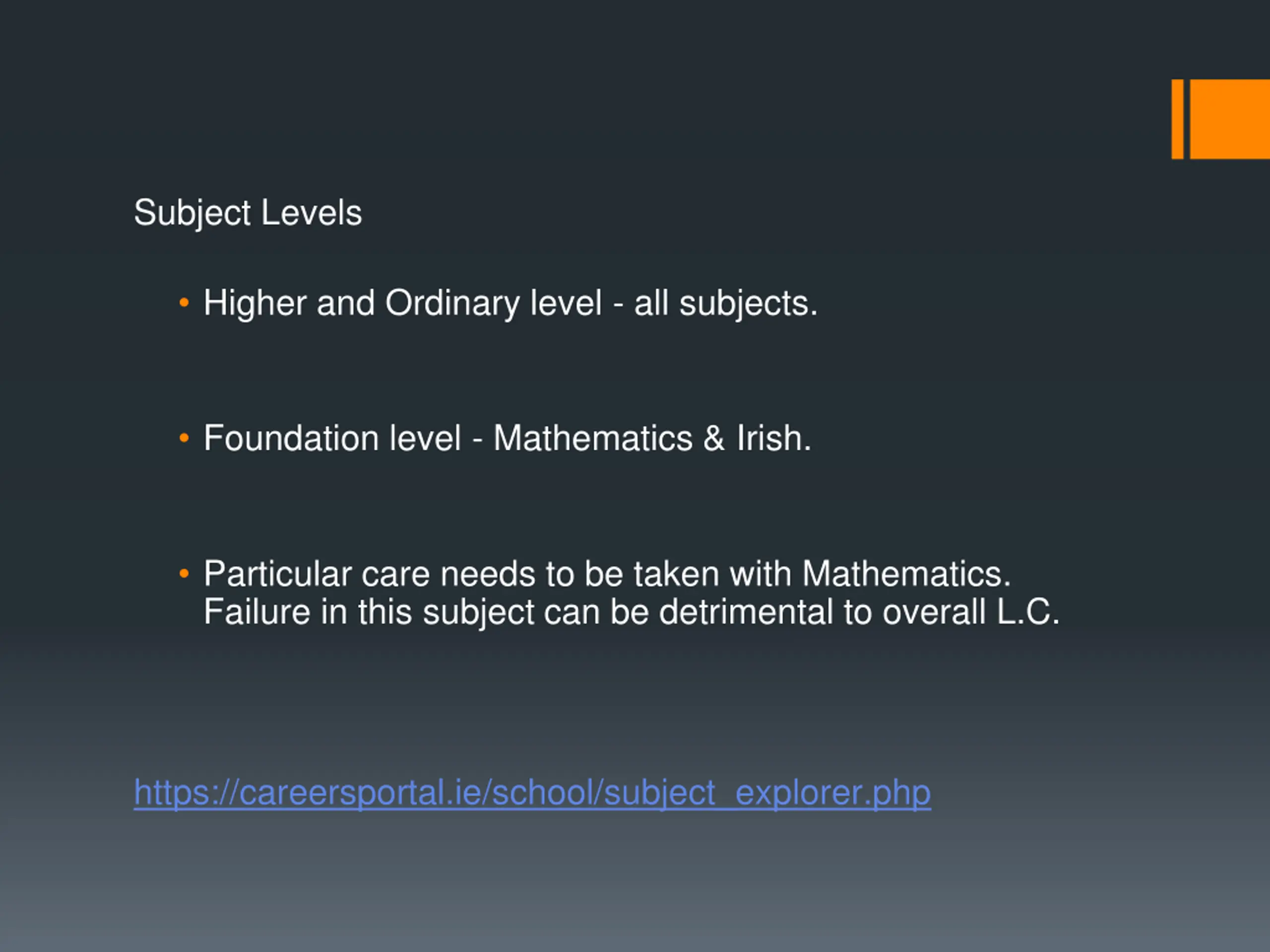 Subject Levels Higher and Ordinary level - all subjects. Foundation level - Mathematics & Irish. Particular care needs to be taken with Mathematics. Failure in this subject can be detrimental to overall L.C. https://careersportal.ie/school/subject_explorer.php