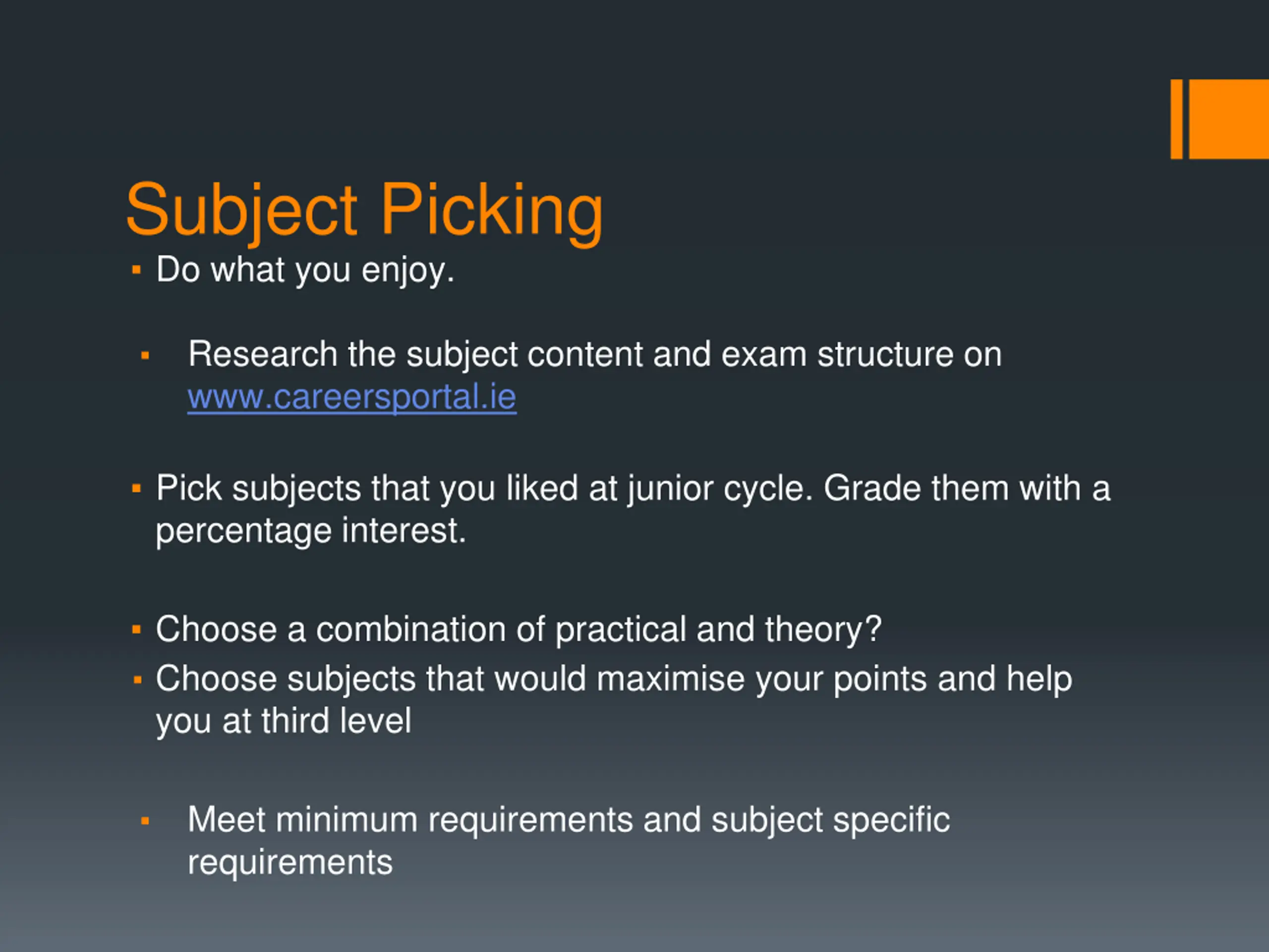 Subject Picking Do what you enjoy. Research the subject content and exam structure on www.careersportal.ie Pick subjects that you liked at junior cycle. Grade them with a percentage interest. Choose a combination of practical and theory? Choose subjects that would maximise your points and help you at third level Meet minimum requirements and subject specific requirements
