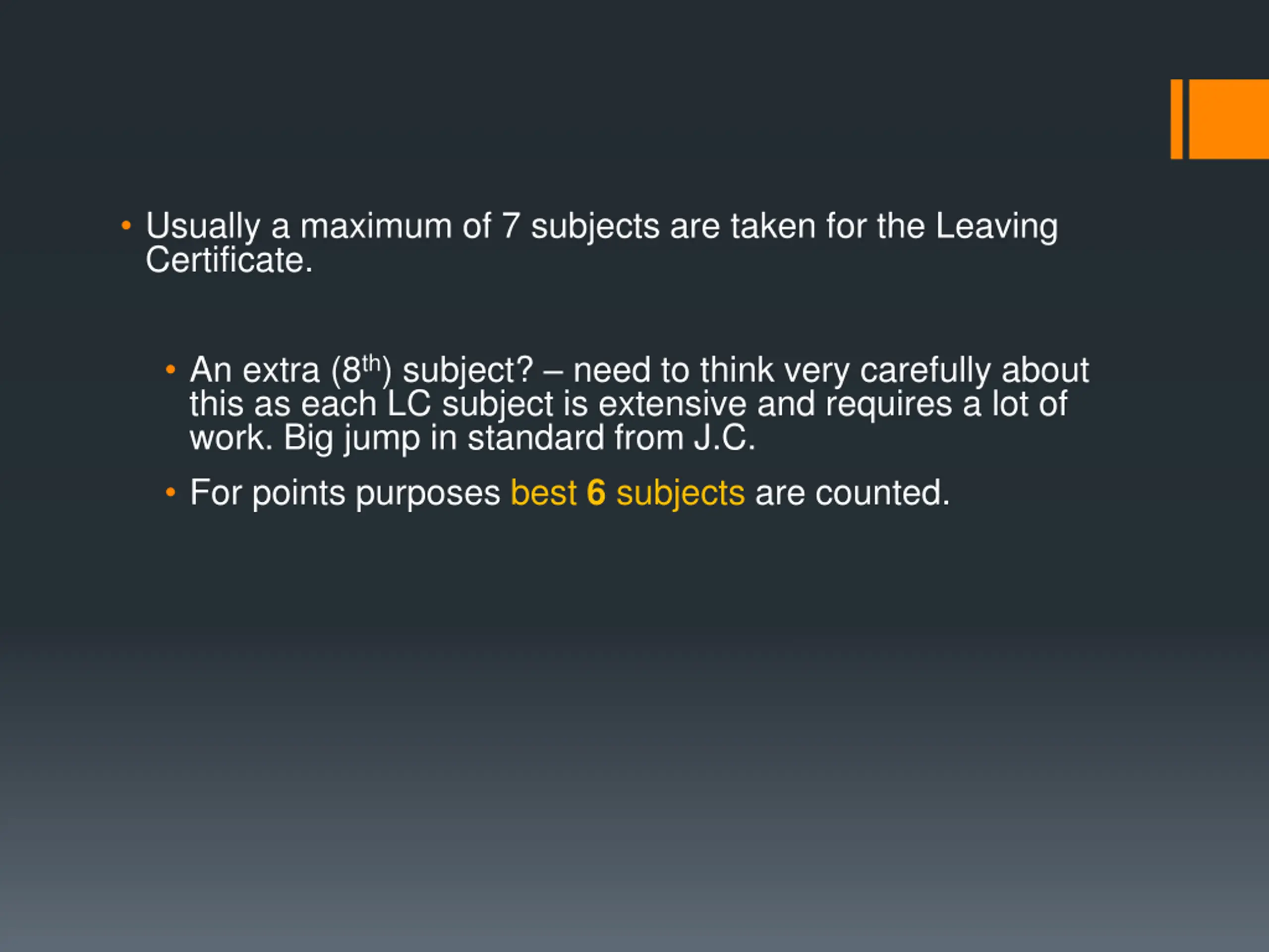 Usually a maximum of 7 subjects are taken for the Leaving Certificate. An extra (8th) subject? need to think very carefully about this as each LC subject is extensive and requires a lot of work. Big jump in standard from J.C. For points purposes best 6 subjects are counted.