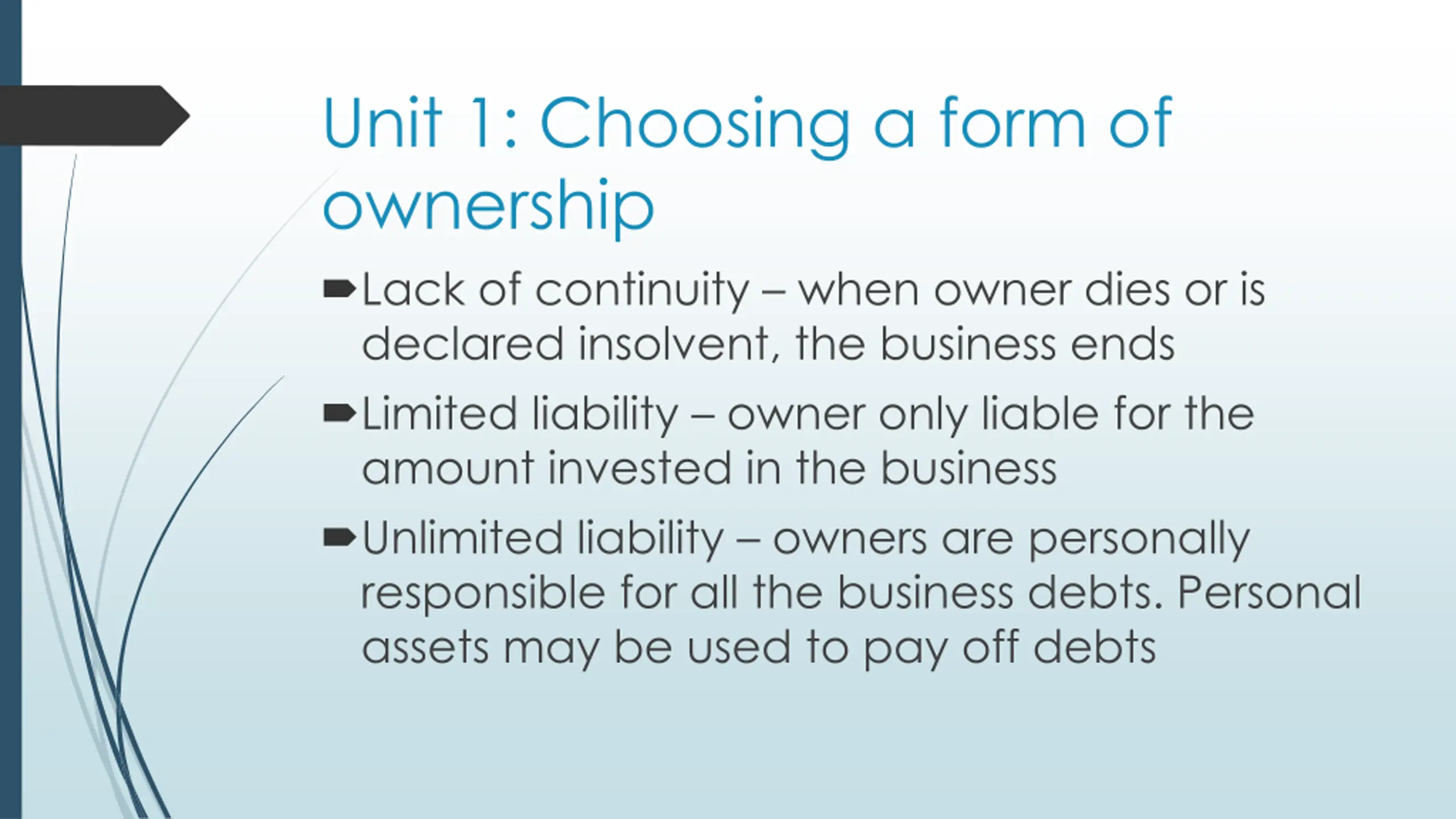 Unit 1: Choosing a form of ownership Lack of continuity when owner dies or is declared insolvent, the business ends Limited liability owner only liable for the amount invested in the business Unlimited liability owners are personally responsible for all the business debts. Personal assets may be used to pay off debts