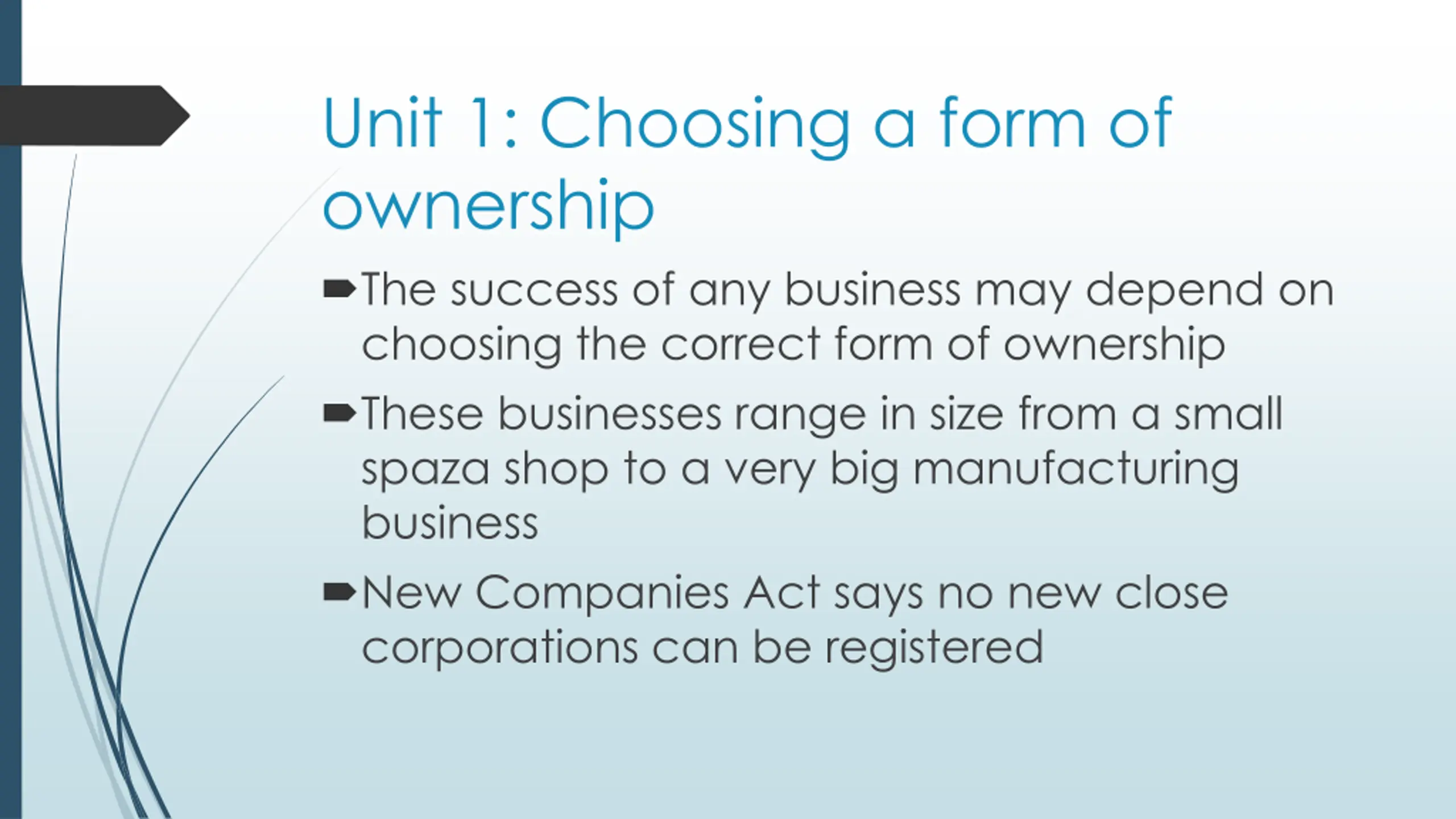 Unit 1: Choosing a form of ownership The success of any business may depend on choosing the correct form of ownership These businesses range in size from a small spaza shop to a very big manufacturing business New Companies Act says no new close corporations can be registered