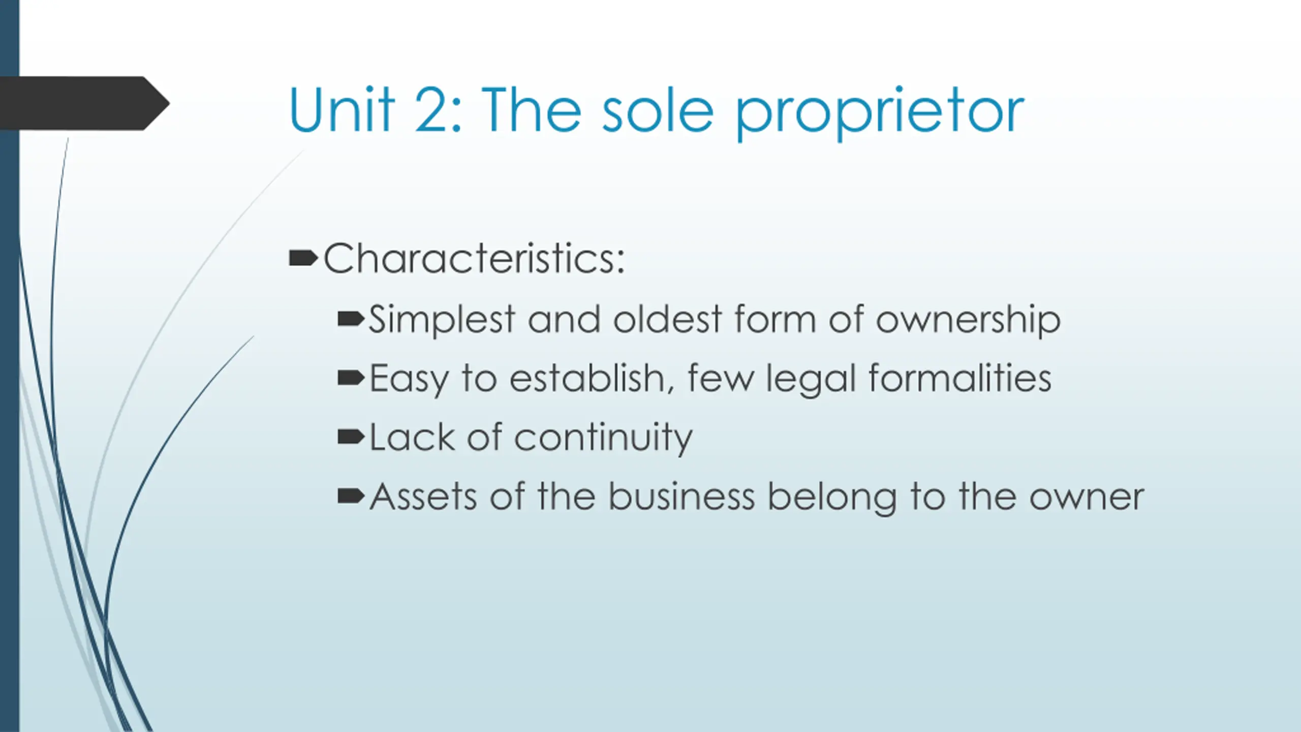 Unit 2: The sole proprietor Characteristics: Simplest and oldest form of ownership Easy to establish, few legal formalities Lack of continuity Assets of the business belong to the owner