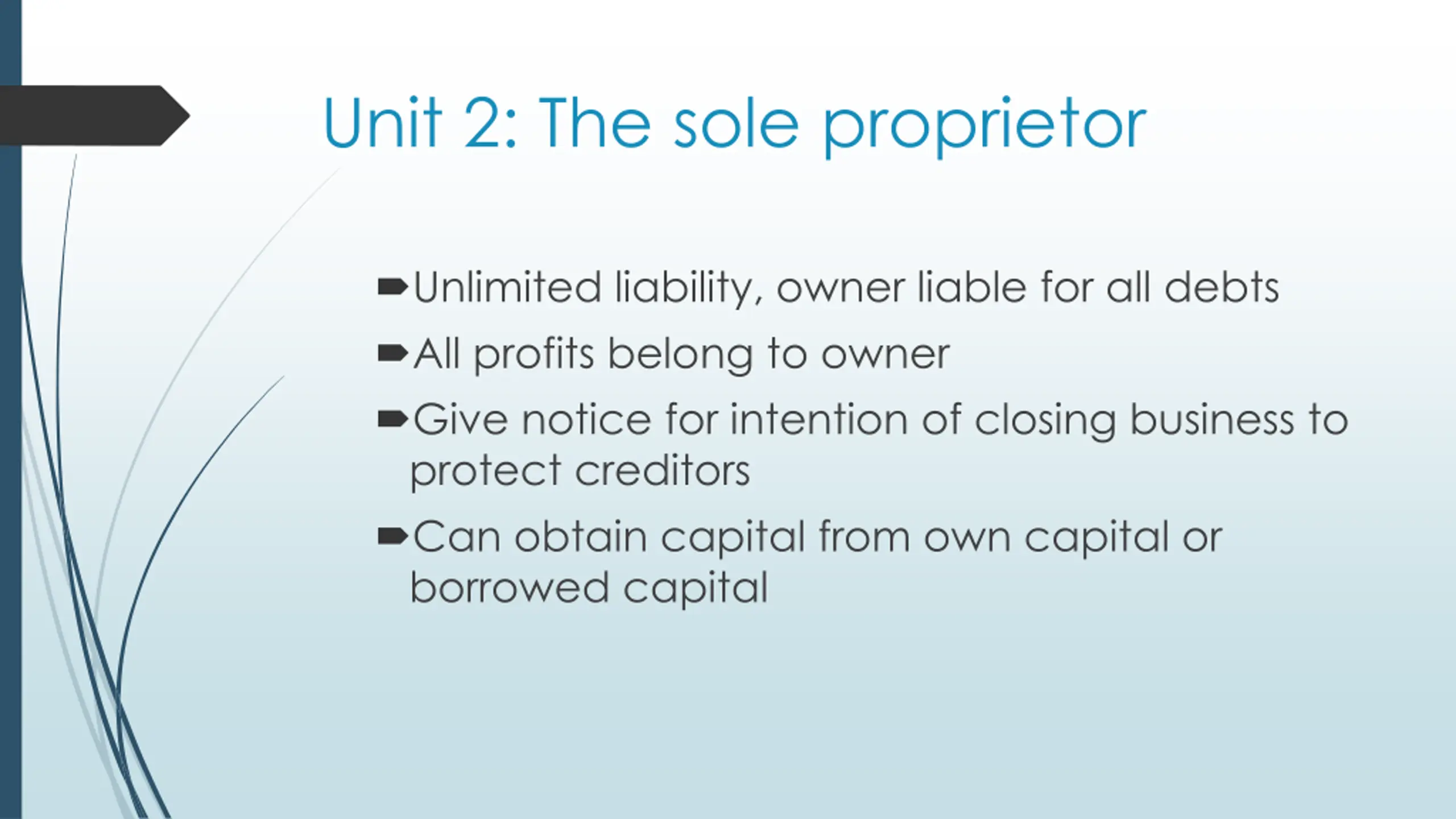 Unit 2: The sole proprietor Unlimited liability, owner liable for all debts All profits belong to owner Give notice for intention of closing business to protect creditors Can obtain capital from own capital or borrowed capital