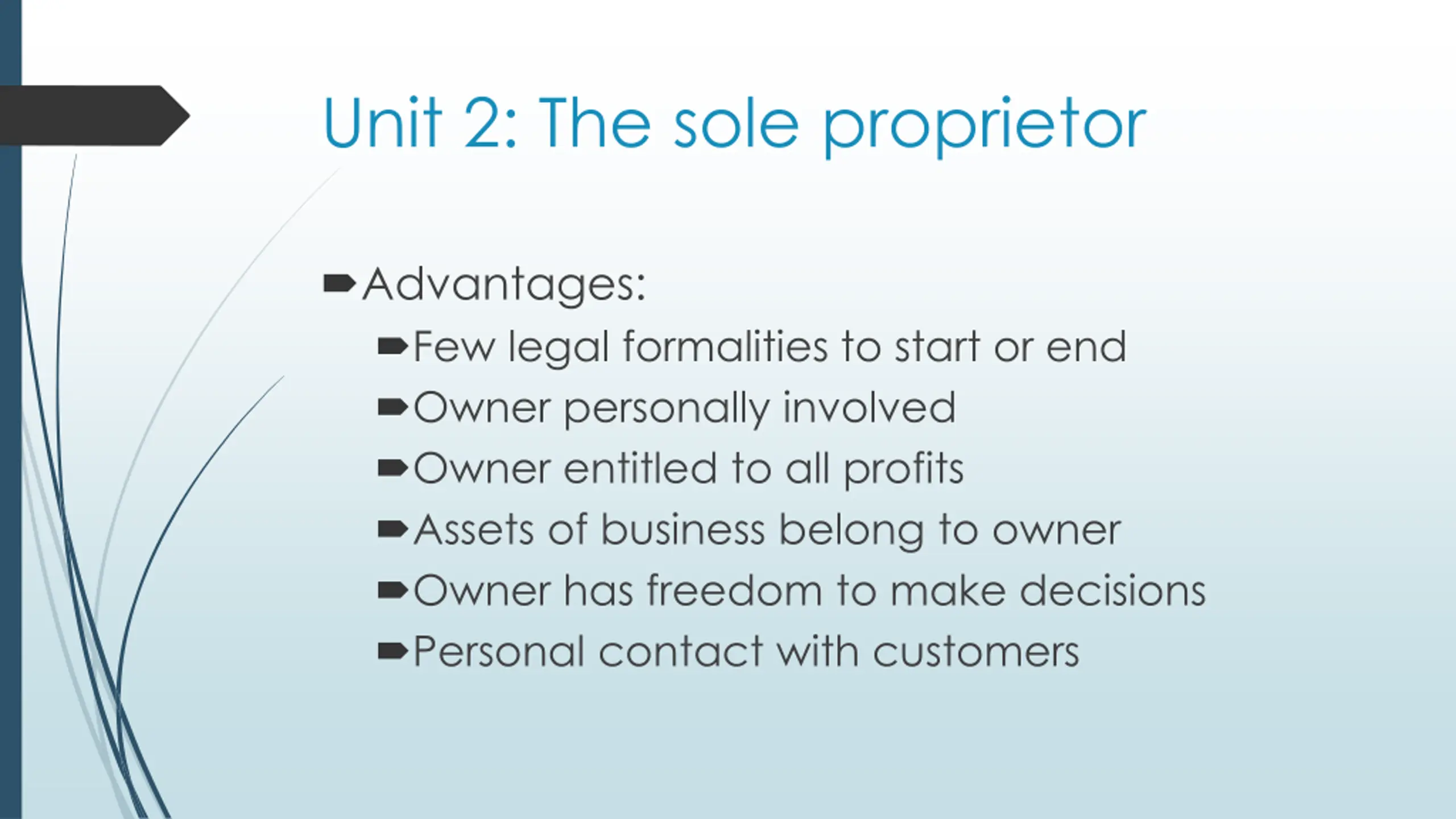 Unit 2: The sole proprietor Advantages: Few legal formalities to start or end Owner personally involved Owner entitled to all profits Assets of business belong to owner Owner has freedom to make decisions Personal contact with customers