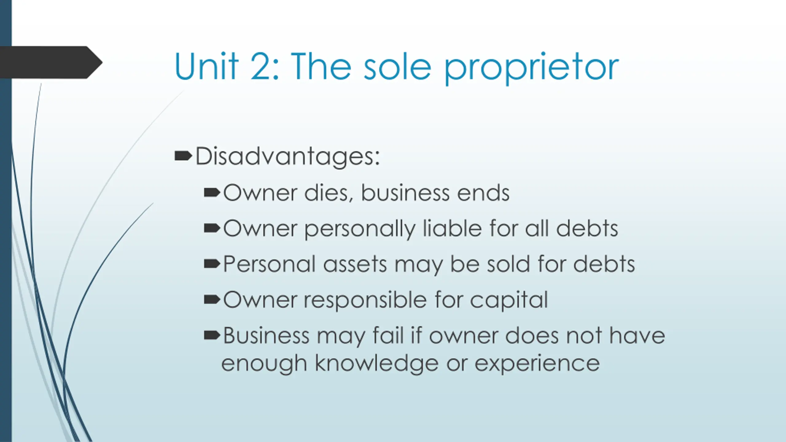 Unit 2: The sole proprietor Disadvantages: Owner dies, business ends Owner personally liable for all debts Personal assets may be sold for debts Owner responsible for capital Business may fail if owner does not have enough knowledge or experience