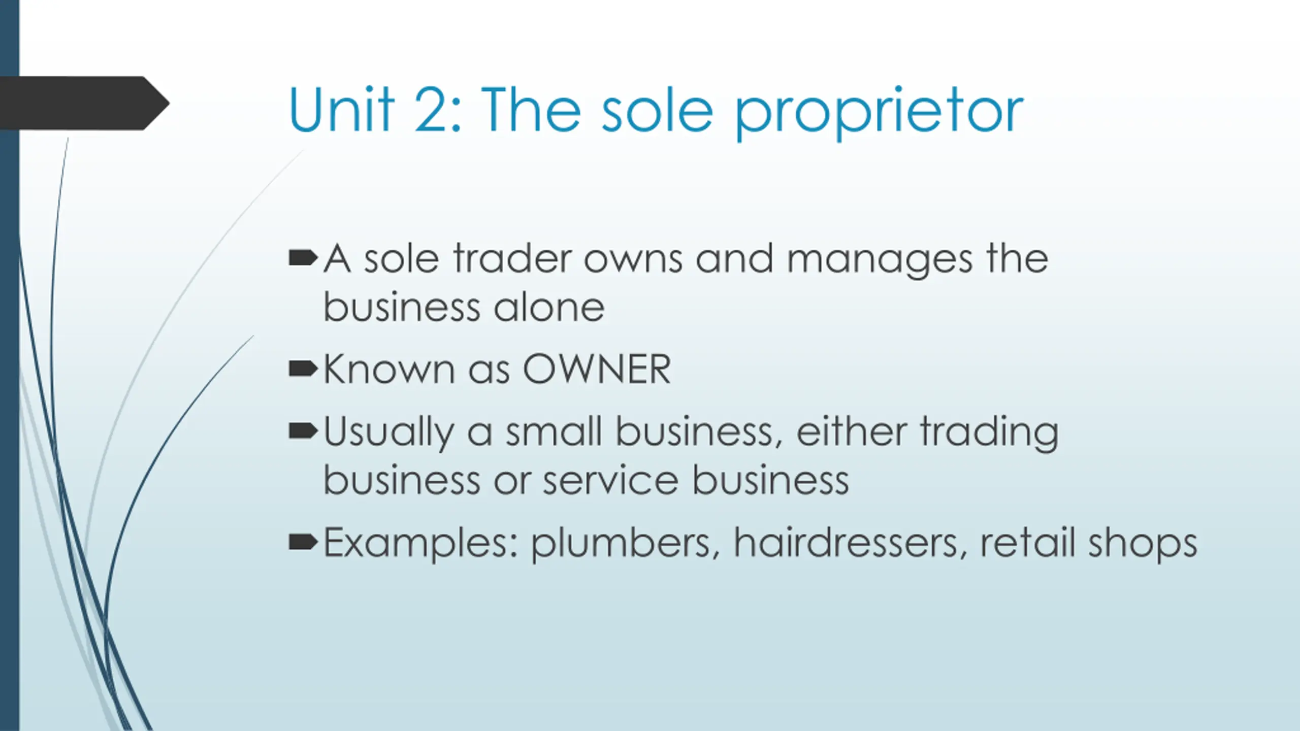 Unit 2: The sole proprietor A sole trader owns and manages the business alone Known as OWNER Usually a small business, either trading business or service business Examples: plumbers, hairdressers, retail shops