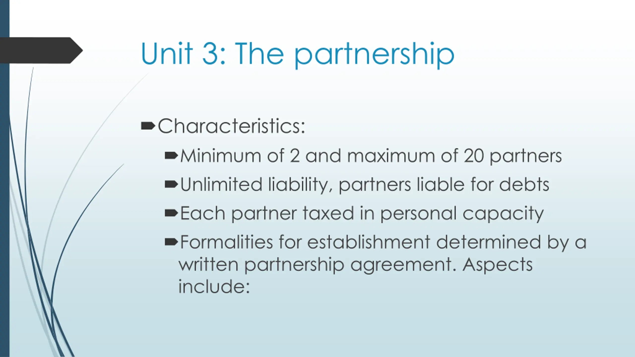 Unit 3: The partnership Characteristics: Minimum of 2 and maximum of 20 partners Unlimited liability, partners liable for debts Each partner taxed in personal capacity Formalities for establishment determined by a written partnership agreement. Aspects include: