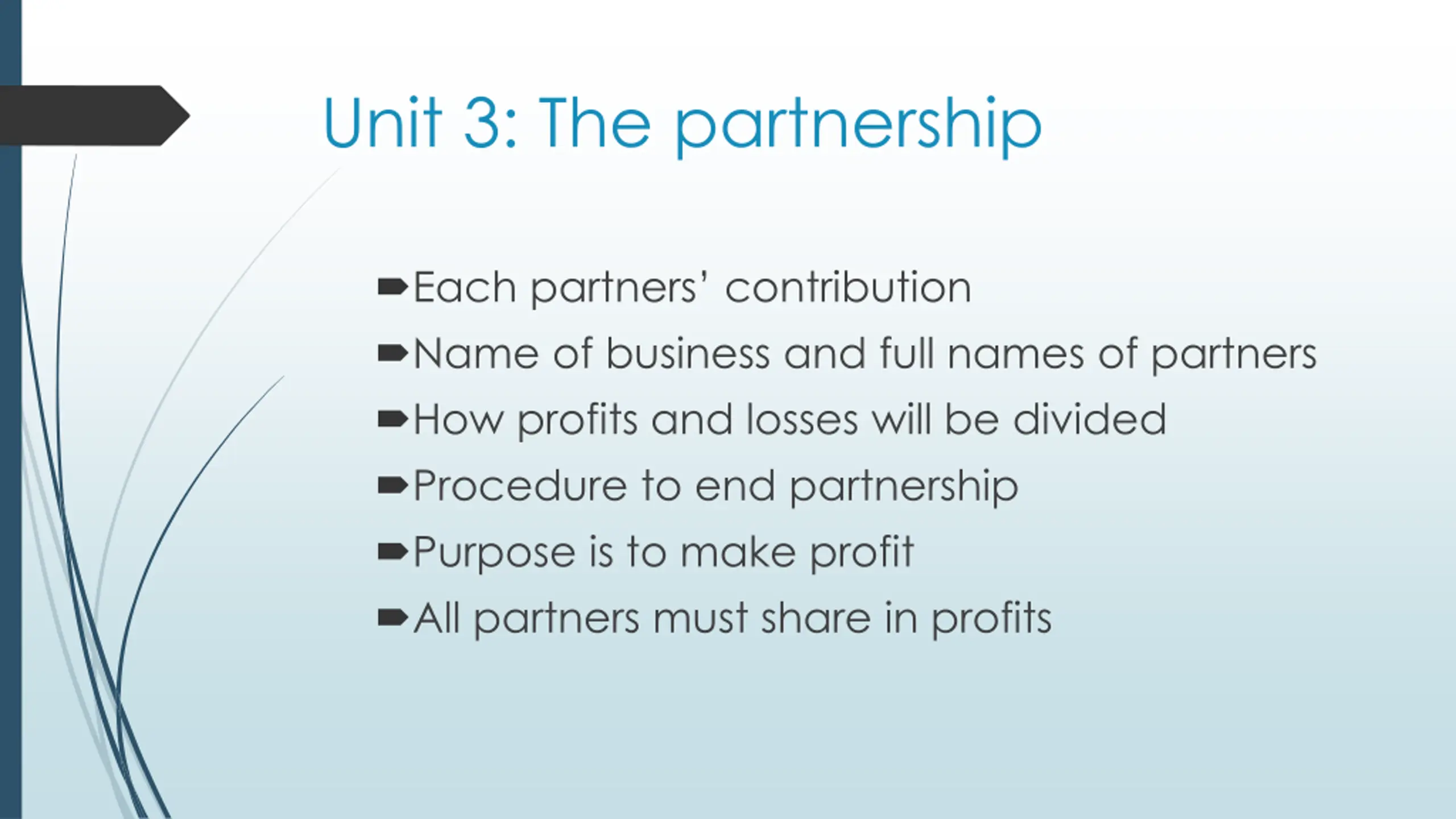 Unit 3: The partnership Each partners contribution Name of business and full names of partners How profits and losses will be divided Procedure to end partnership Purpose is to make profit All partners must share in profits