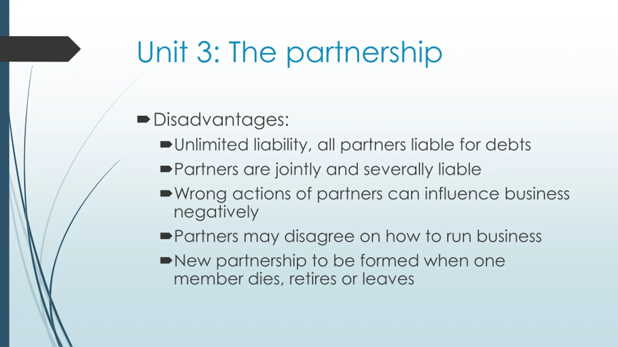 Unit 3: The partnership Disadvantages: Unlimited liability, all partners liable for debts Partners are jointly and severally liable Wrong actions of partners can influence business negatively Partners may disagree on how to run business New partnership to be formed when one member dies, retires or leaves