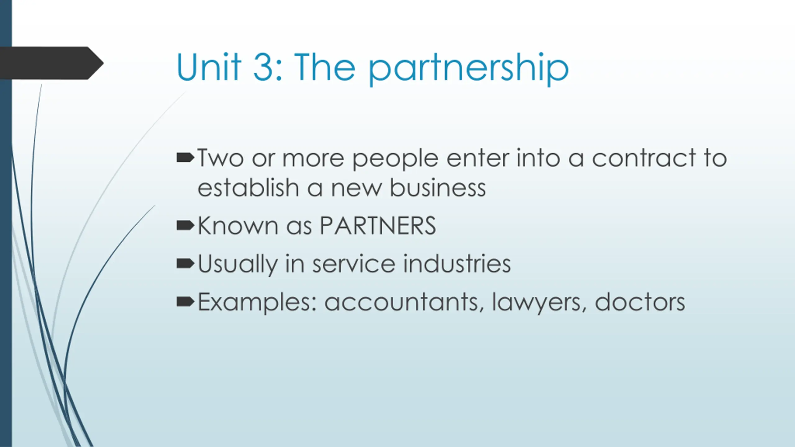 Unit 3: The partnership Two or more people enter into a contract to establish a new business Known as PARTNERS Usually in service industries Examples: accountants, lawyers, doctors