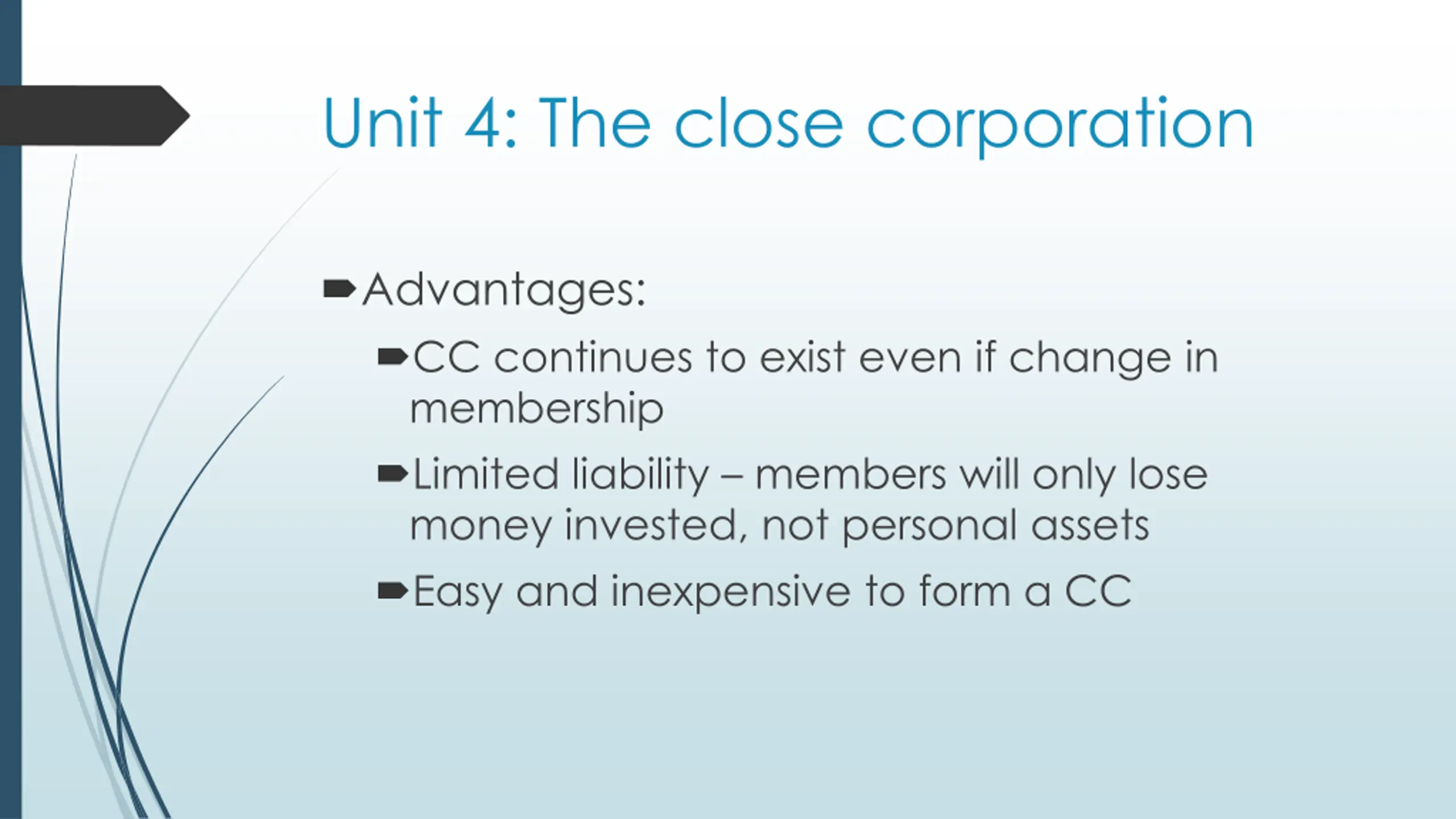 Unit 4: The close corporation Advantages: CC continues to exist even if change in membership Limited liability members will only lose money invested, not personal assets Easy and inexpensive to form a CC