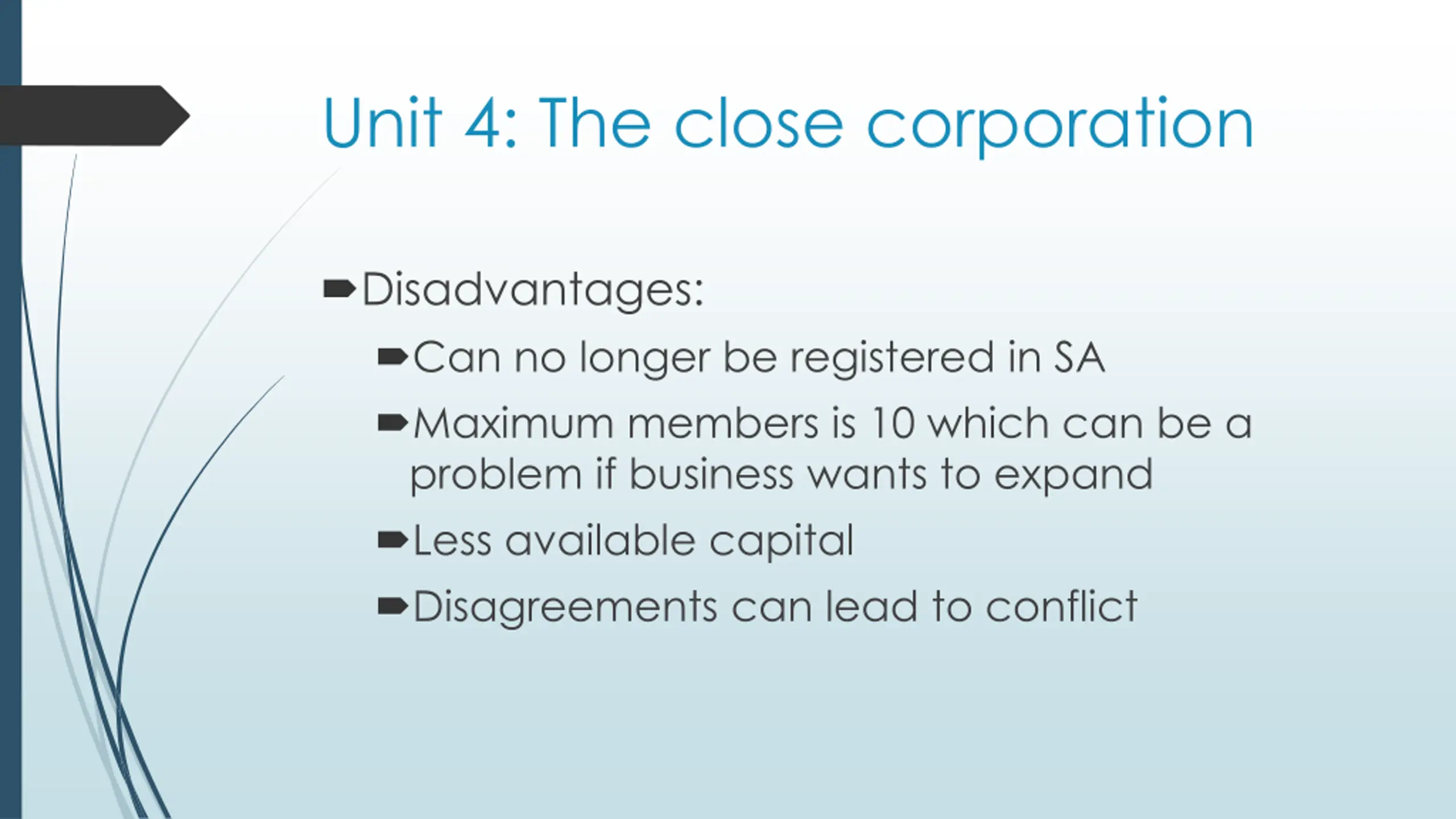 Unit 4: The close corporation Disadvantages: Can no longer be registered in SA Maximum members is 10 which can be a problem if business wants to expand Less available capital Disagreements can lead to conflict